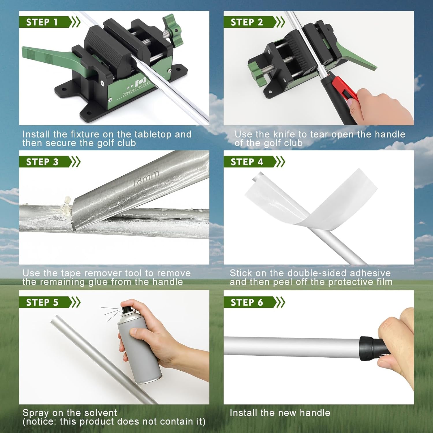 - Includes: this kit includes a golf club vise, a secure, retractable hook knife, a quick tape remover, 13 strips of double sided tape, a pair of gloves, and an instruction manual, providing all the necessary supplies for a complete grip change