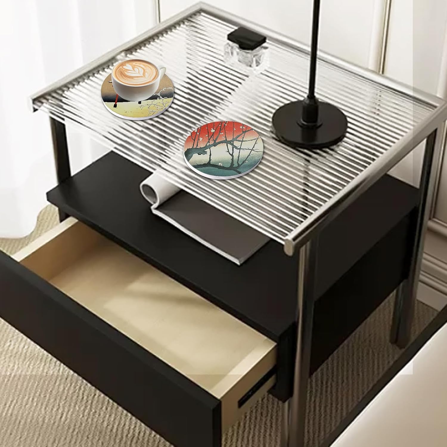 - METERIAL: Our ceramic coasters are made of ceramic and cork bottom. Ceramics material are fragile, please put them in a safe place. If there is any damage after receiving our products, please contact us immediately, and we will propose a reasonable solution for you.