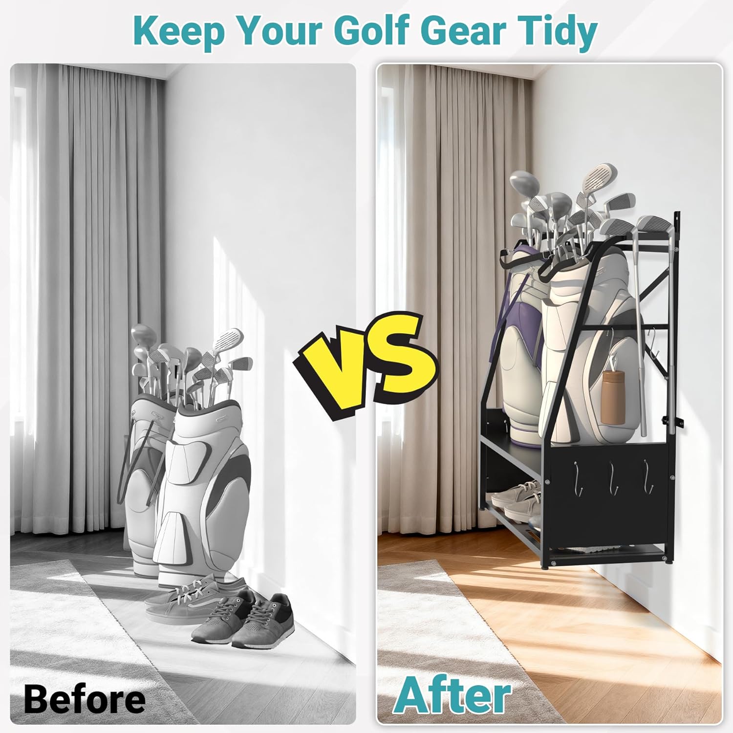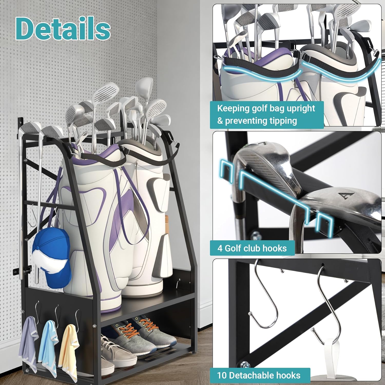 - Extra-Large Capacity: Our Golf Bag Organizer holds up to 2 golf bags, secured by 2 adjustable straps. It features 2 club hooks (holding up to 4 clubs) plus 10 additional detachable hooks. Open shelves provide ample space for hats, gloves, shoes, and other accessories