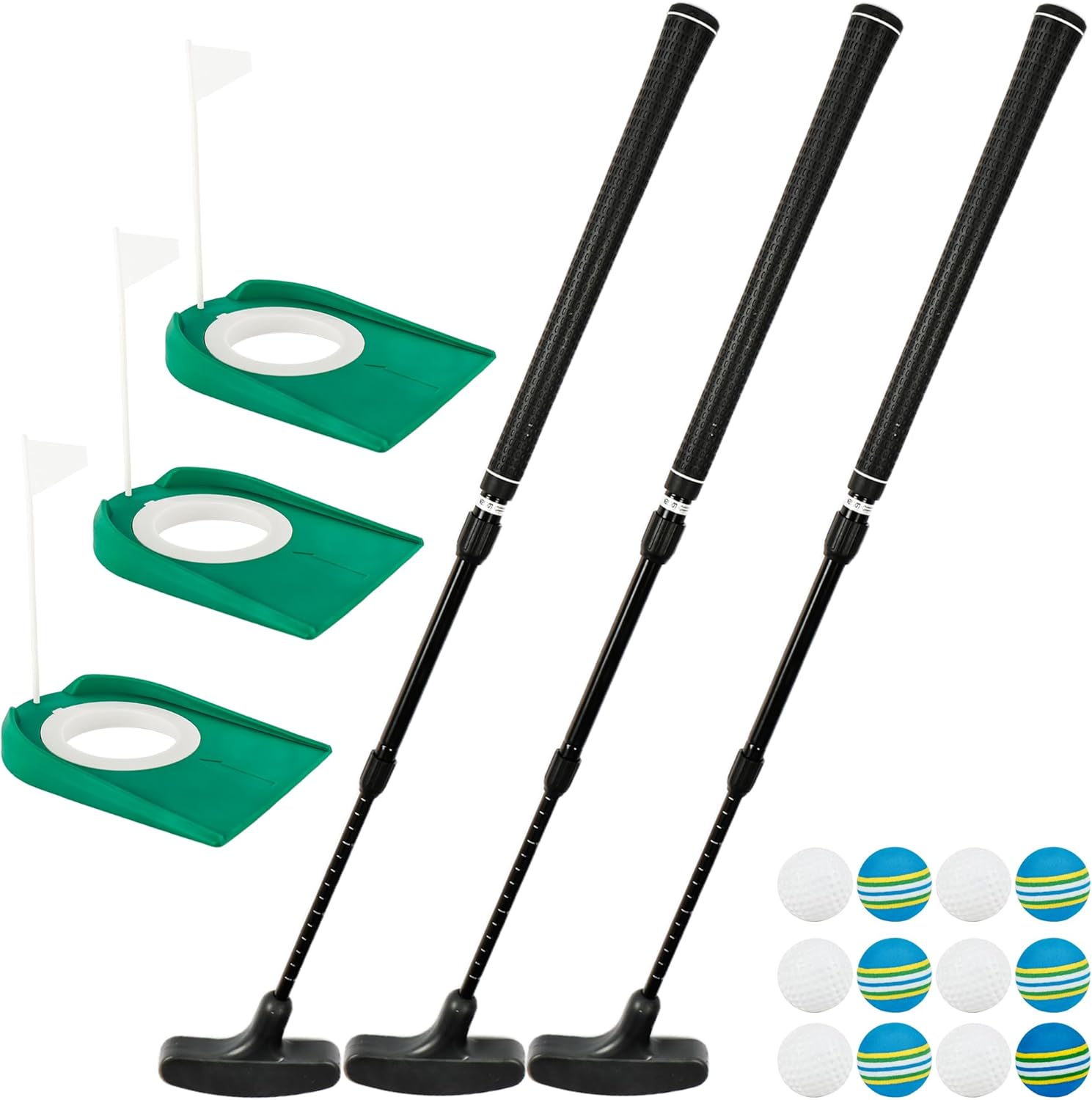 - Included Components : 3 adjustable putters, 3 putting cups with flags, 6 foam golf balls, 6 practice golf balls
