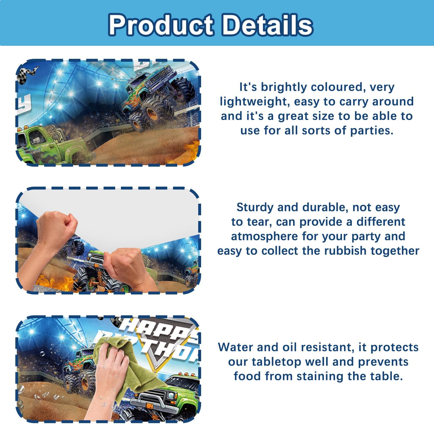 - 【Multipurpose】 This Monster Truck theme party tablecloth is the perfect ornament for your birthday party, and it can be matched with any other party decorations. There are perfect parties, birthday parties, indoor and outdoor activities, arts and crafts projects, holiday decorations, family use, table decorations and any other celebrations.