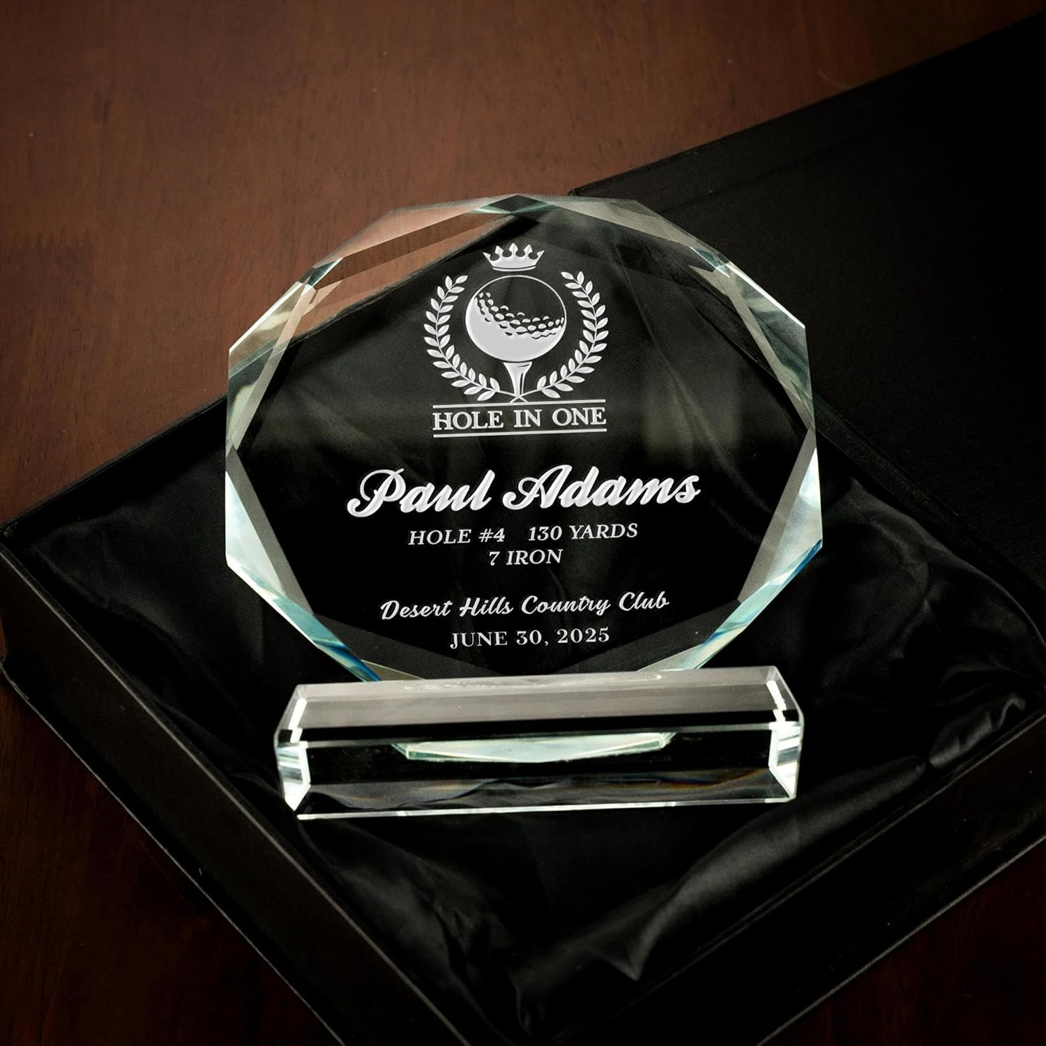 - Personalized Hole In One Trophy: Custom-engraved hole in one trophy with golfer’s name, date, hole, yardage, and club used, crafted from crystal with beveled edges for a sleek, polished look.