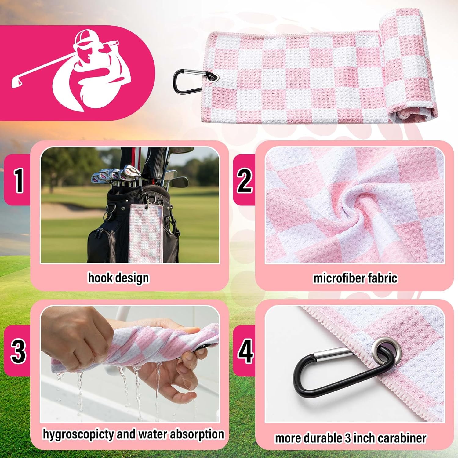 - Golf Towel: this microfiber pink golf towel adopts waffle design, which can remove dirt, mud, sand and grass, and designed with buckle, easy to carry, bringing you a nice using experience