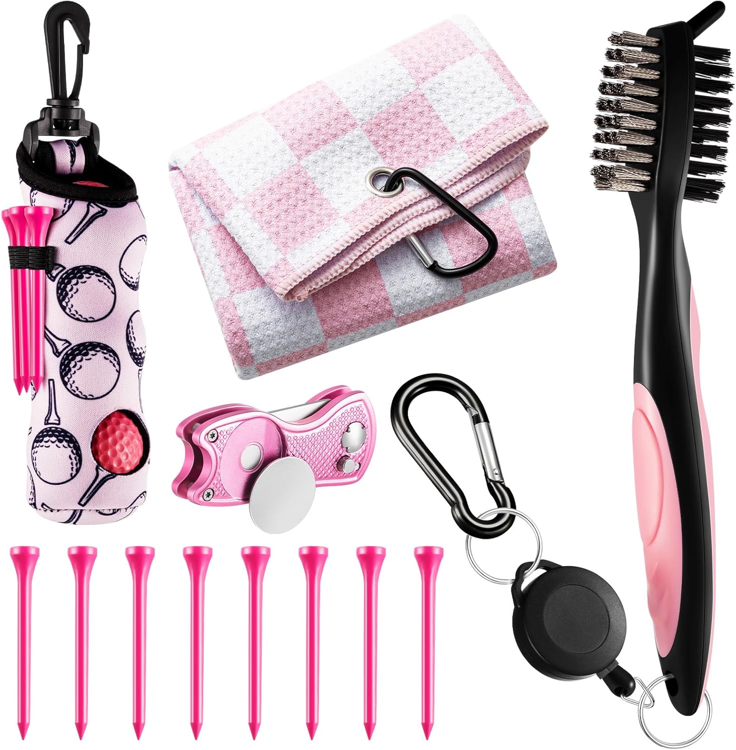- Nice Combination: you will receive a complete set of light pink golf accessories for women, including pink golf ball bag, pink and white plaid golf towel, 8 golf tees, 1 cleaning brush with a retractable zip line, 1 heavy duty pink divot tool, enough to meet your needs; These light pink designs are low key, soft, elegant and feminine, very suitable for formal golf occasions or charity events, showing gentle female power