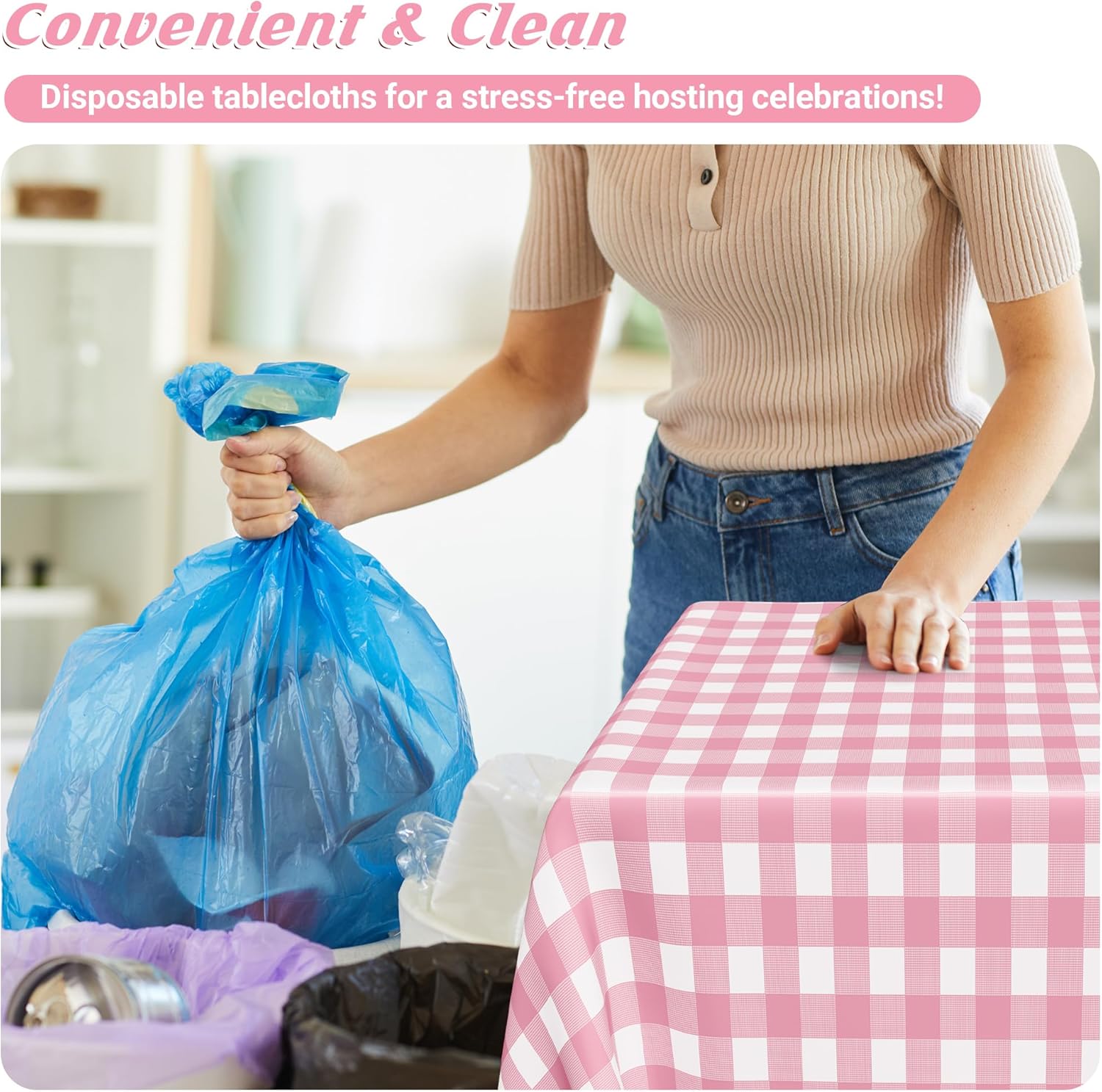 - Vibrant Patterns: Elevate your event with our disposable table cover set, featuring 12 pieces adorned in a striking pink and white checkered design. Perfect for both indoor and outdoor gatherings, these table cloths inject energy into any celebration, ensuring memorable moments