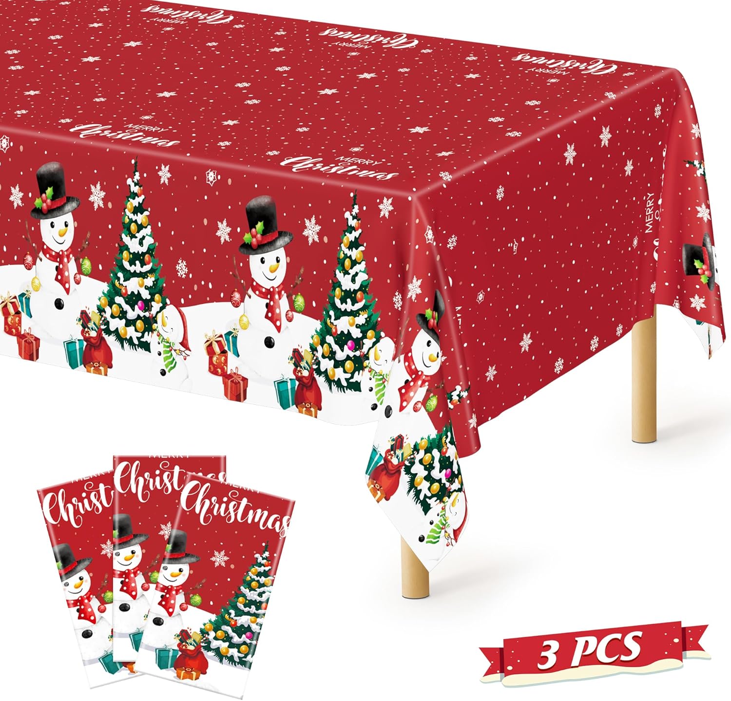 - Snowman Design: This Christmas plastic tablecloth features a red base with added Christmas elements such as snowmen, snowflakes, and Christmas trees, aligning with the holiday theme.