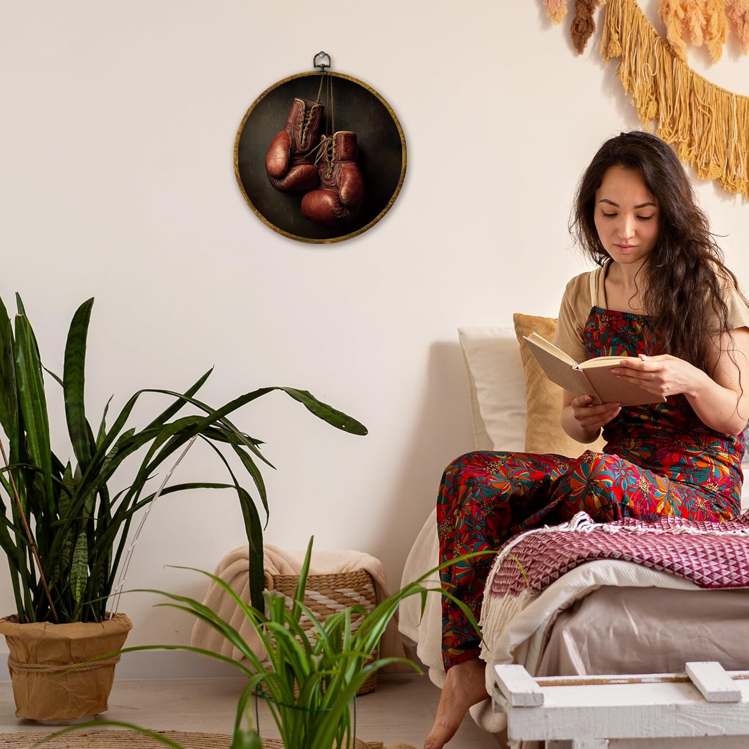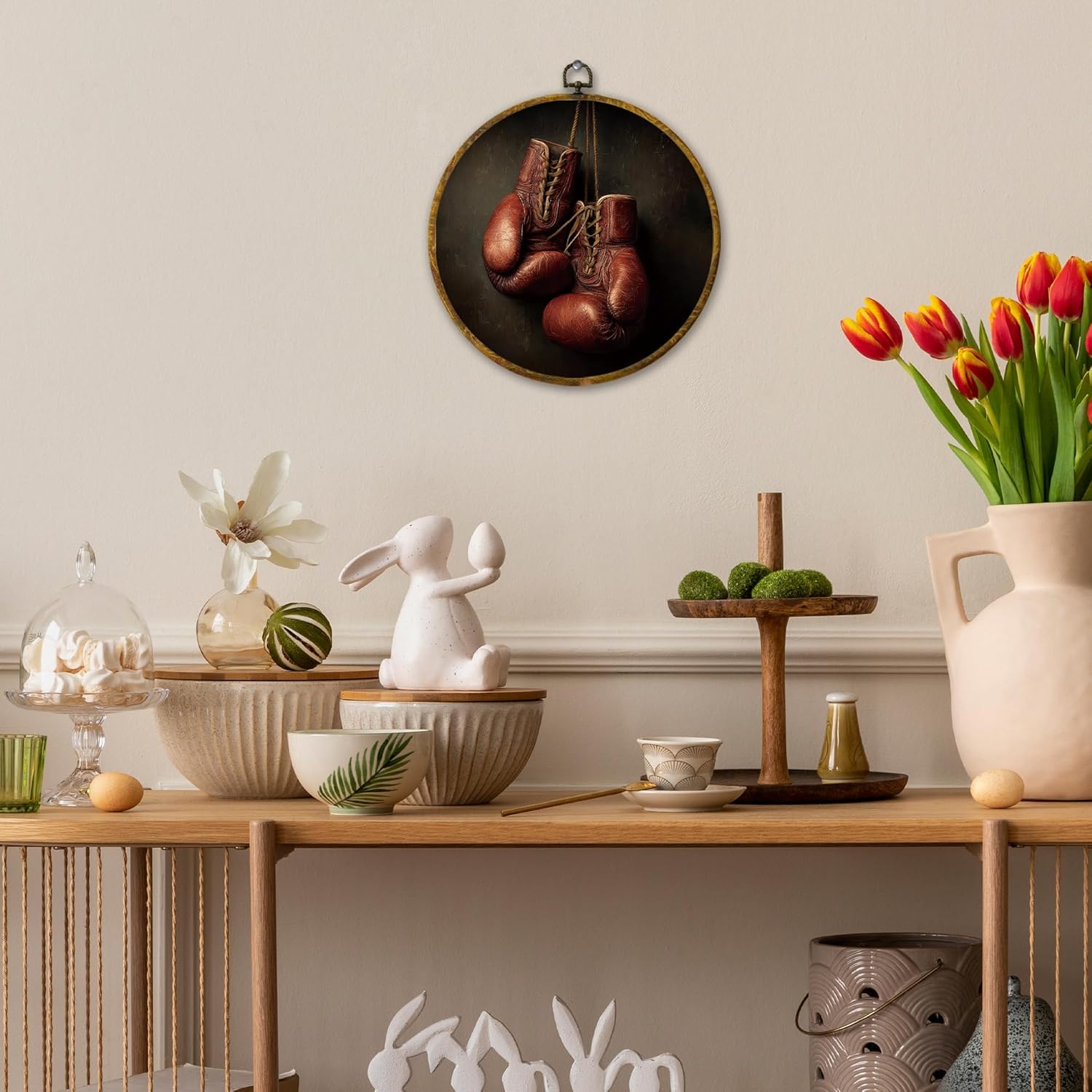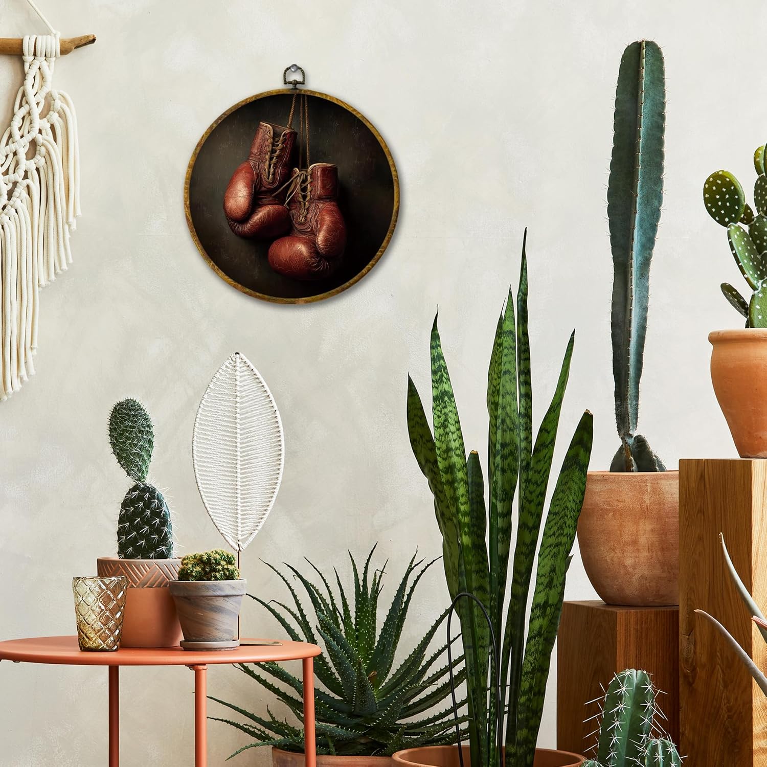 Vintage Red Boxing Gloves Wall Art Decor, Sport Framed Canvas Prints 10x10, Rustic Retro Boxing Round Wall Hanging Artwork Decorations for Home Bedroom Gym Sport Room Man Cave