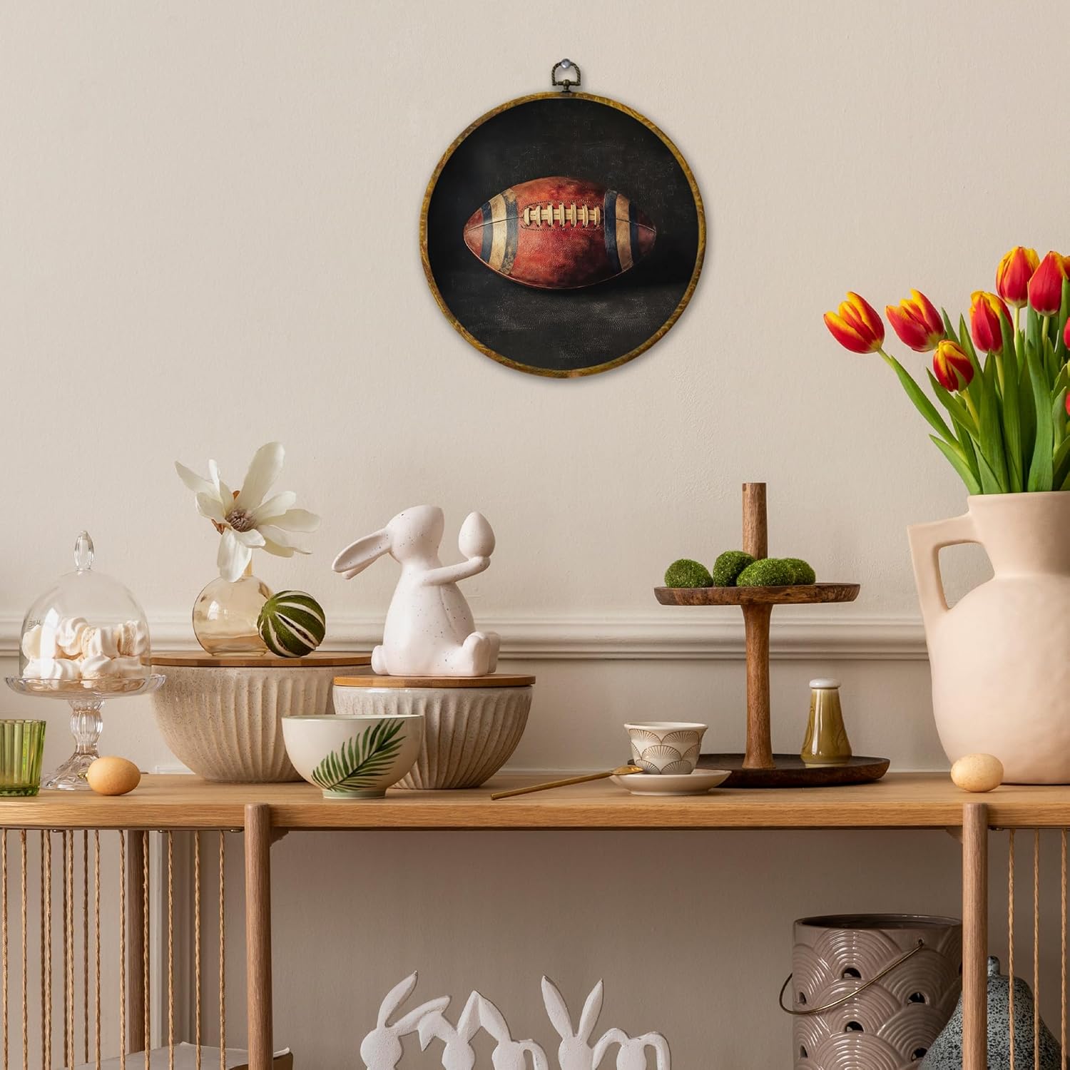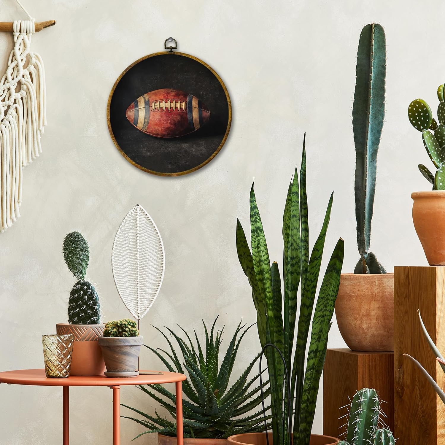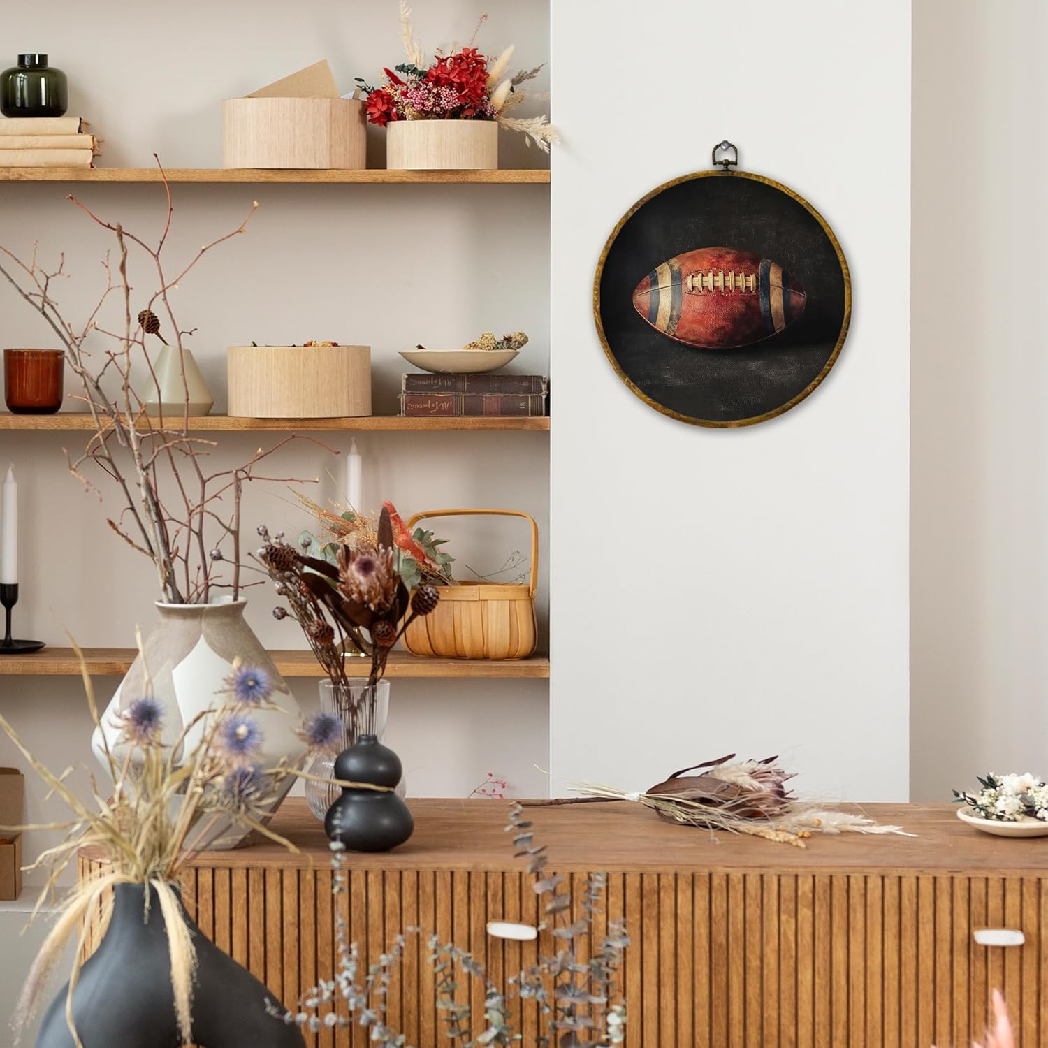 Vintage American Football Wall Art Decor, Retro Sports Framed Canvas Prints 10x10, Rustic Classic Football Round Wall Hanging Artwork Decorations for Bedroom Home Gym Sport Room