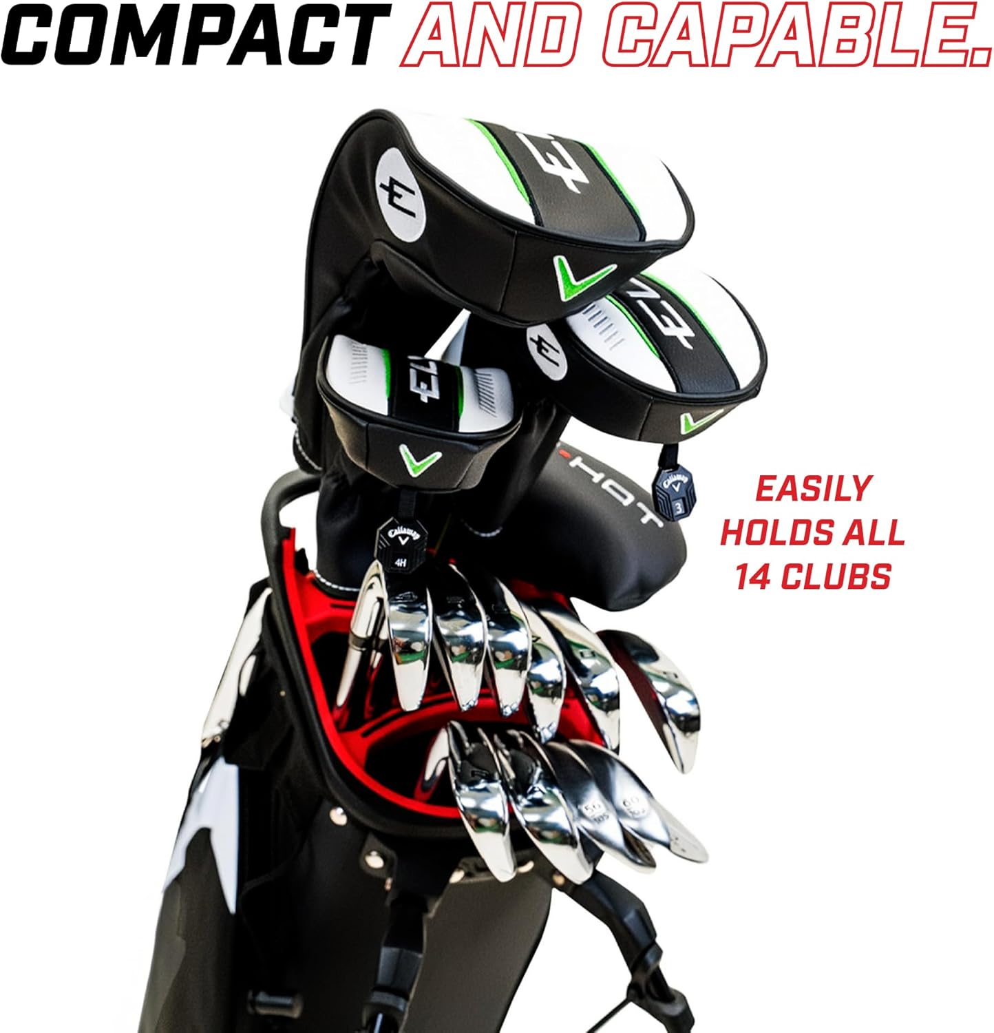 - Compact Design: Crafted to fit all 14 clubs comfortably and features a 3-way molded rubber top divider.