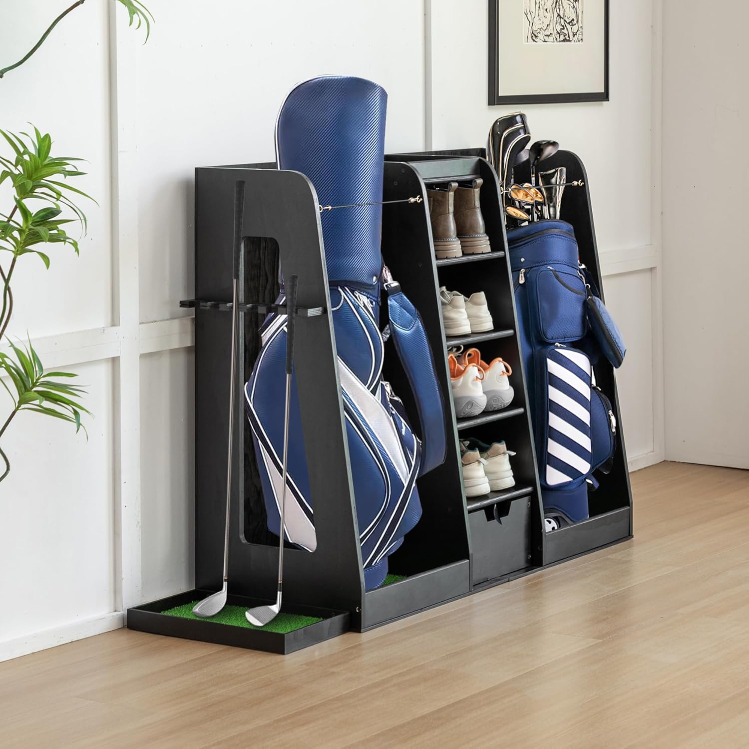 - EXTRA LARGE CAPACITY : This storage cabinet can accommodate 2 full-size bags, 4-5 pairs of golf shoes, approximately 10 golf clubs, and accessories.