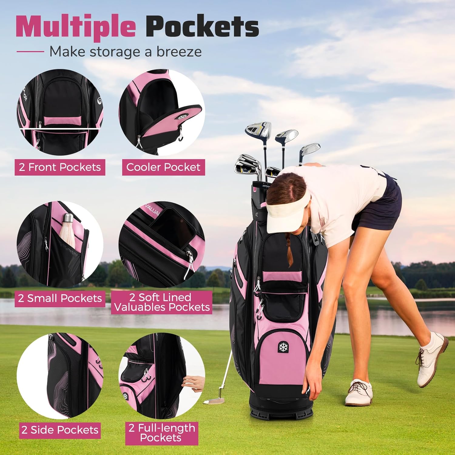 - 【Sufficient Storage Space】 This golf bag offers ample storage with a total of 11 pockets, including 2 front pockets, a cooler pocket, 2 small pockets, 2 soft-lined valuables pockets, 2 side pockets, and 2 full-length pockets. It keeps all your essentials organized and easily accessible.