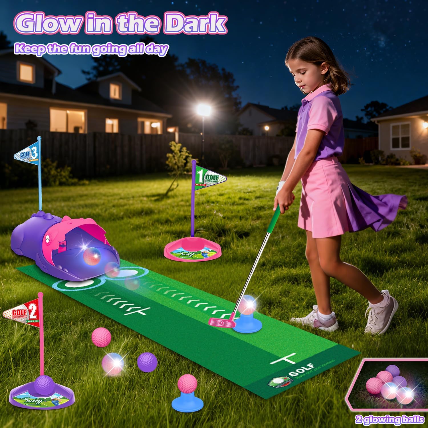 Kids Toy Golf Set with Dinosaur Automatic Golf Returner, Led Light Up Night Golf Balls, 3 Clubs, Putting Mat, 3-8 Toddler Mini Golf Games, Indoor Outdoor Sports Toys for Boys Girls 3+ (Pink)