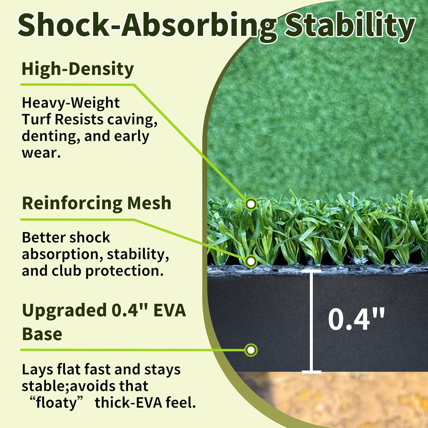 - Shock-Absorbing Stability: Upgraded 0.4" EVA base + reinforcing mesh between turf and EVA deliver better shock absorption, stability, and club protection—ideal as a golf swing mat and all-around golf training mat for daily reps. It easily sits flat and resists edge lift after unrolling for a balanced feel—avoids the “floaty” sensation of overly thick EVA base.