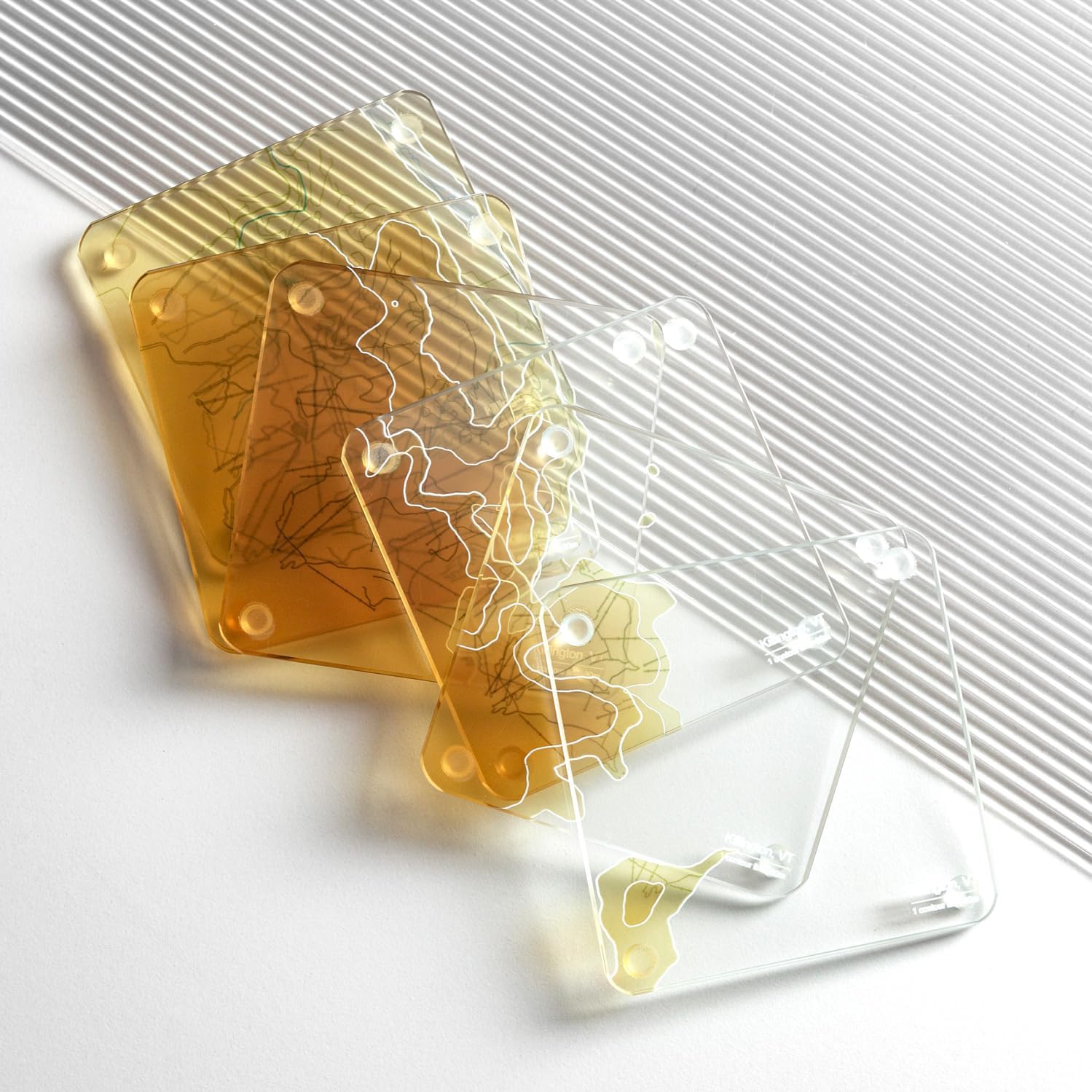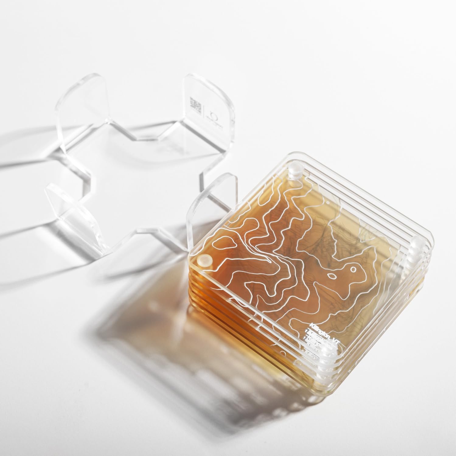 - 3D Contour Map Glass Drink Coasters of Mountains, Ski Resort:O3 Design Studio's original 3D contour coaster distributes contour lines on six coasters, making them stacked up to create a three-dimensional mountain。 Compared to printed maps, you can more clearly understand the relationship between roads, rivers, mountain cable cars and contour lines.