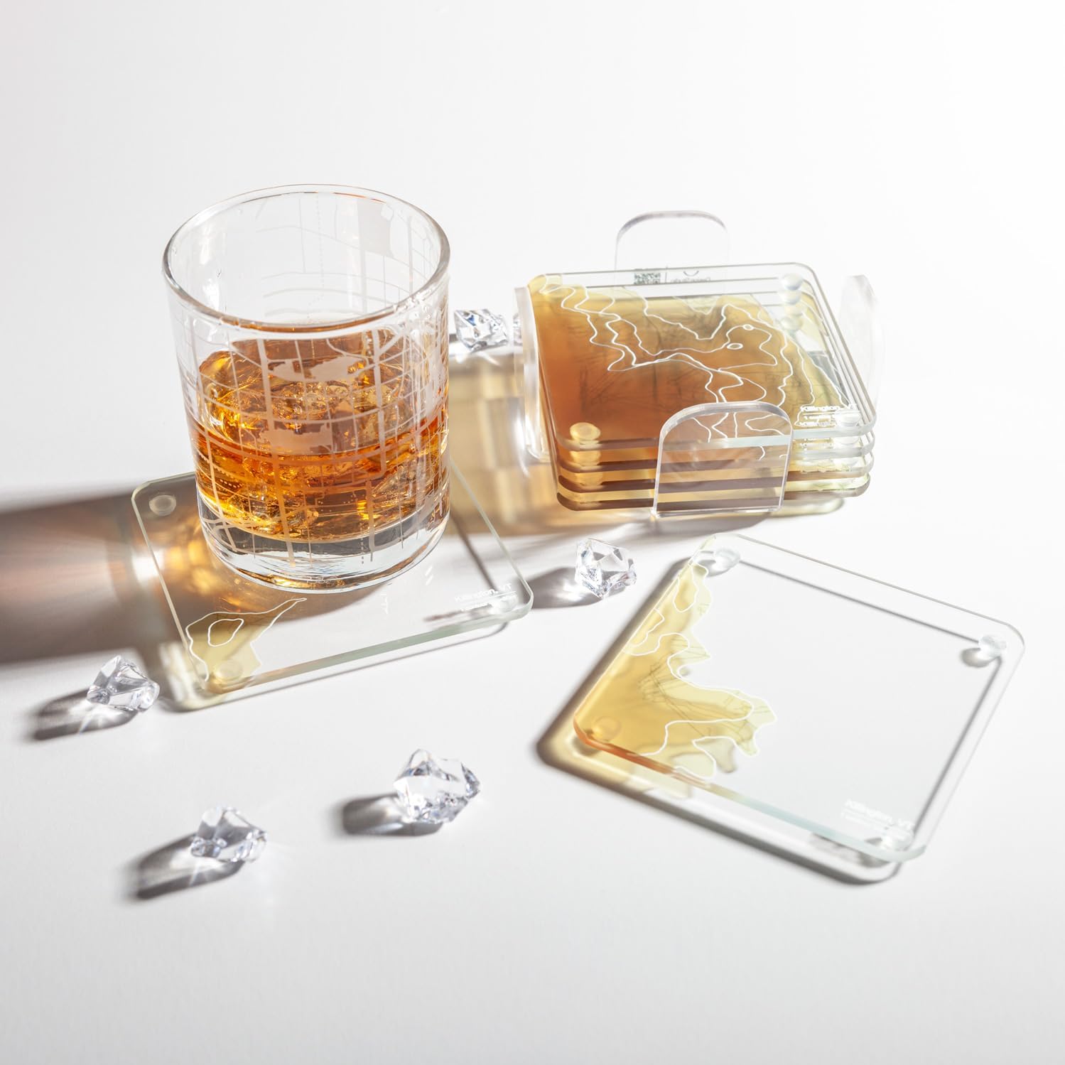 Killington, VT 3D Contour Map Glass Drink Coasters of Mountains, Ski Resort, Set of 6 with Holder, Housewarming Birthday Gifts, Home Décor