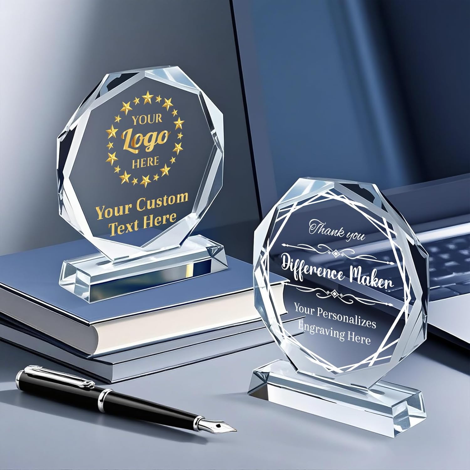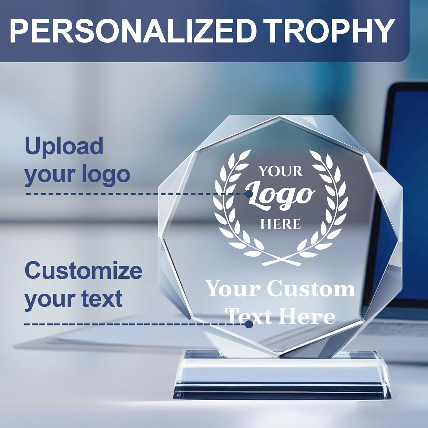 Personalized Crystal Trophy Award - Custom Plaque w/Engraved Text Logo - Employee Appreciation Gifts, Farewell Retirement Gifts - Custom Trophy and Employee Recognition Awards