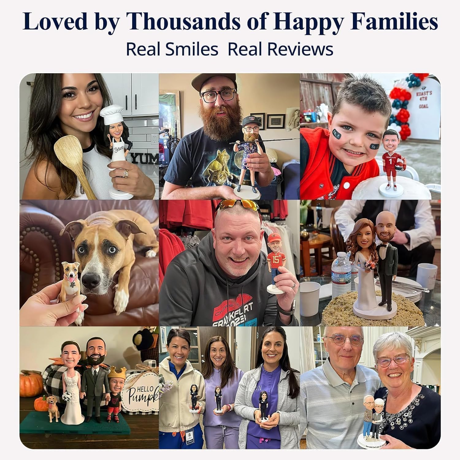 - Handmade Craftsmanship Every bobblehead is carefully handcrafted by skilled artisans to capture the unique features and personality of your loved one. Made from your photo, each figure is a high-quality, lifelike sculpture designed to last and be cherished for years to come.