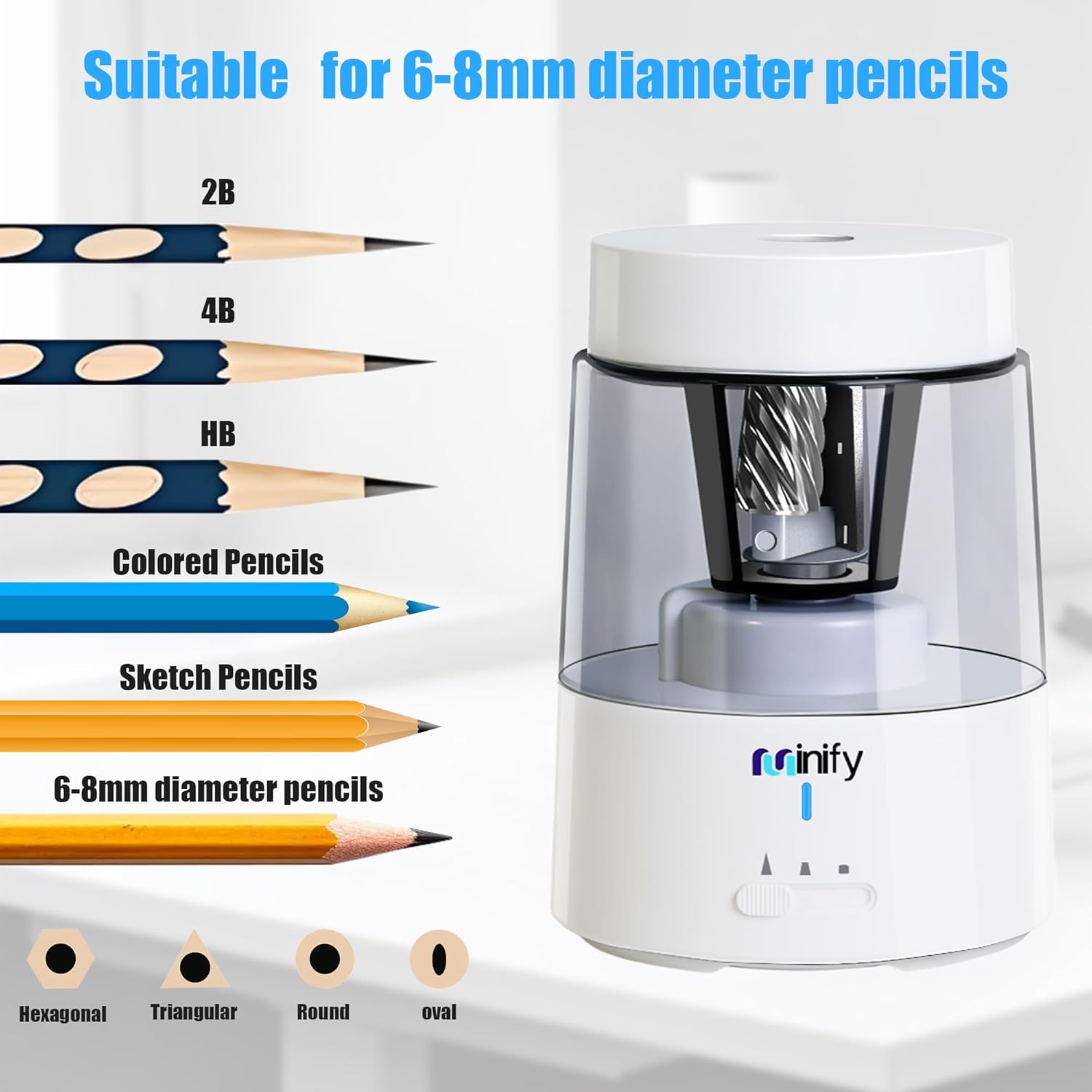 - Auto Stop and Fast Pencil Sharpener: Minify Electric Pencil Sharpener can sharpen a new pencil in five seconds, and sharpen a blunt pencil in three seconds. The Pencil Sharpener will auto stop when it sharpen at a great point. Just insert the pencil and it will automatically stop when sharpened