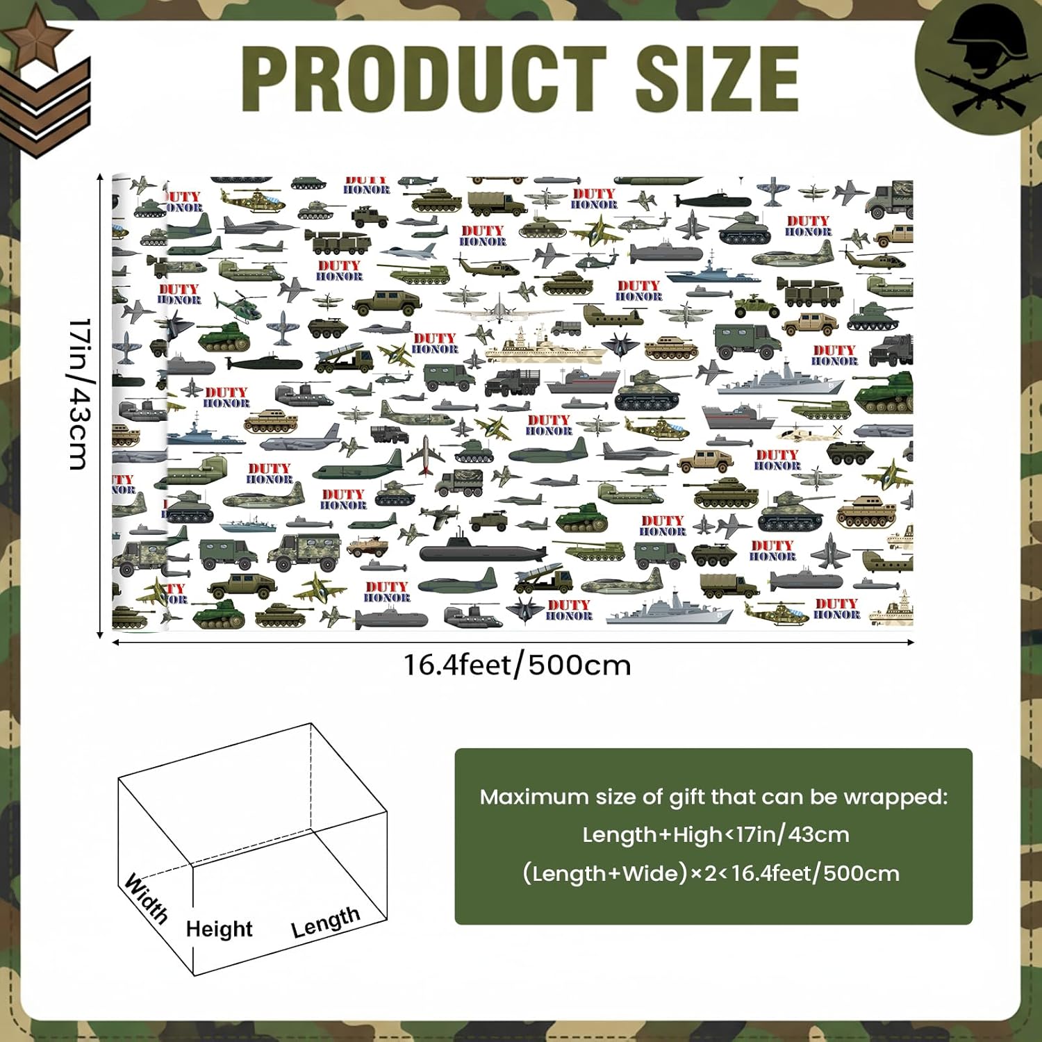 - PERFECT FOR MILITARY CELEBRATIONS & ENTHUSIASTS:A thoughtful choice for wrapping gifts for soldiers,veterans,or military family members.Whether for a Veterans Day event,retirement ceremony,deployment party,or military birthday celebration,this wrapping paper enhances the presentation of any armed forces-related gift.