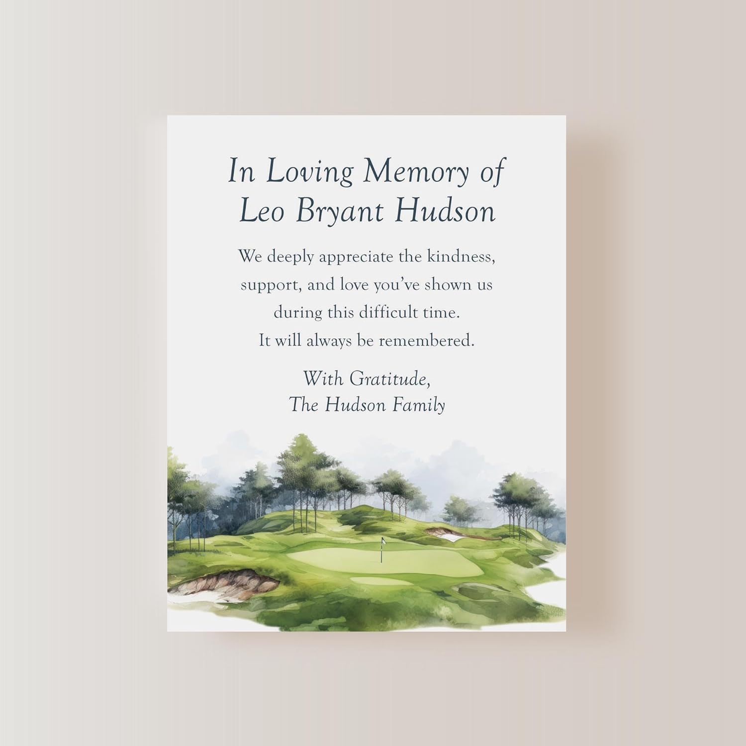 - A Sincere Thank You: Express gratitude with an appreciative message that’s personalized with your loved one’s name. These watercolor, golf-themed flat note cards are ideal for thanking those who have offered support and love during a difficult time of loss.