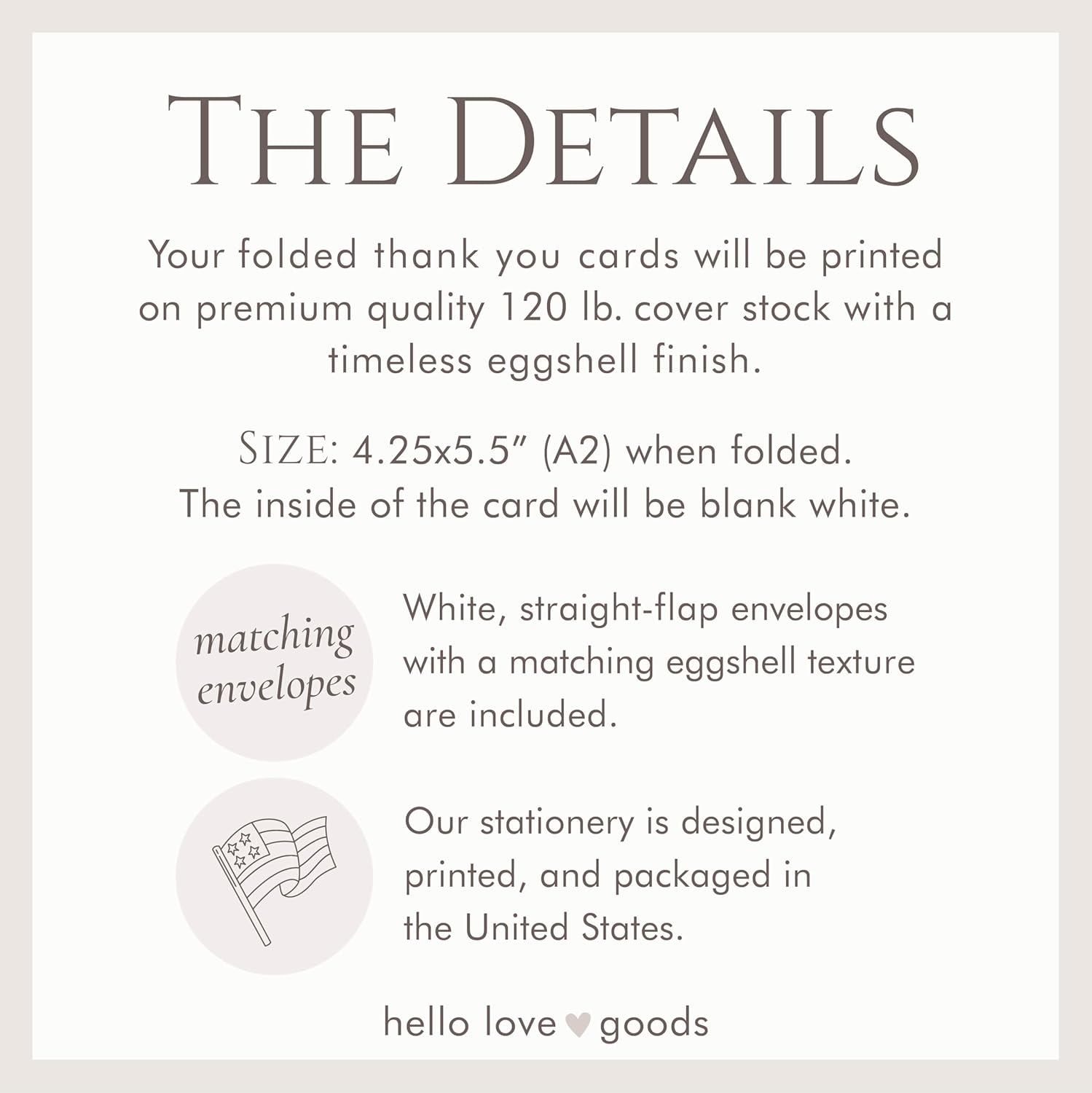 - Premium Cover Stock: Our folded 4.25 x 5.5” (A2) thank you cards are printed on 120 lb. white cover stock with an eggshell finish. Matching white eggshell envelopes are included. The cards will arrive flat with a prescored line for easy folding. A small logo will appear on the back of the card near the bottom.