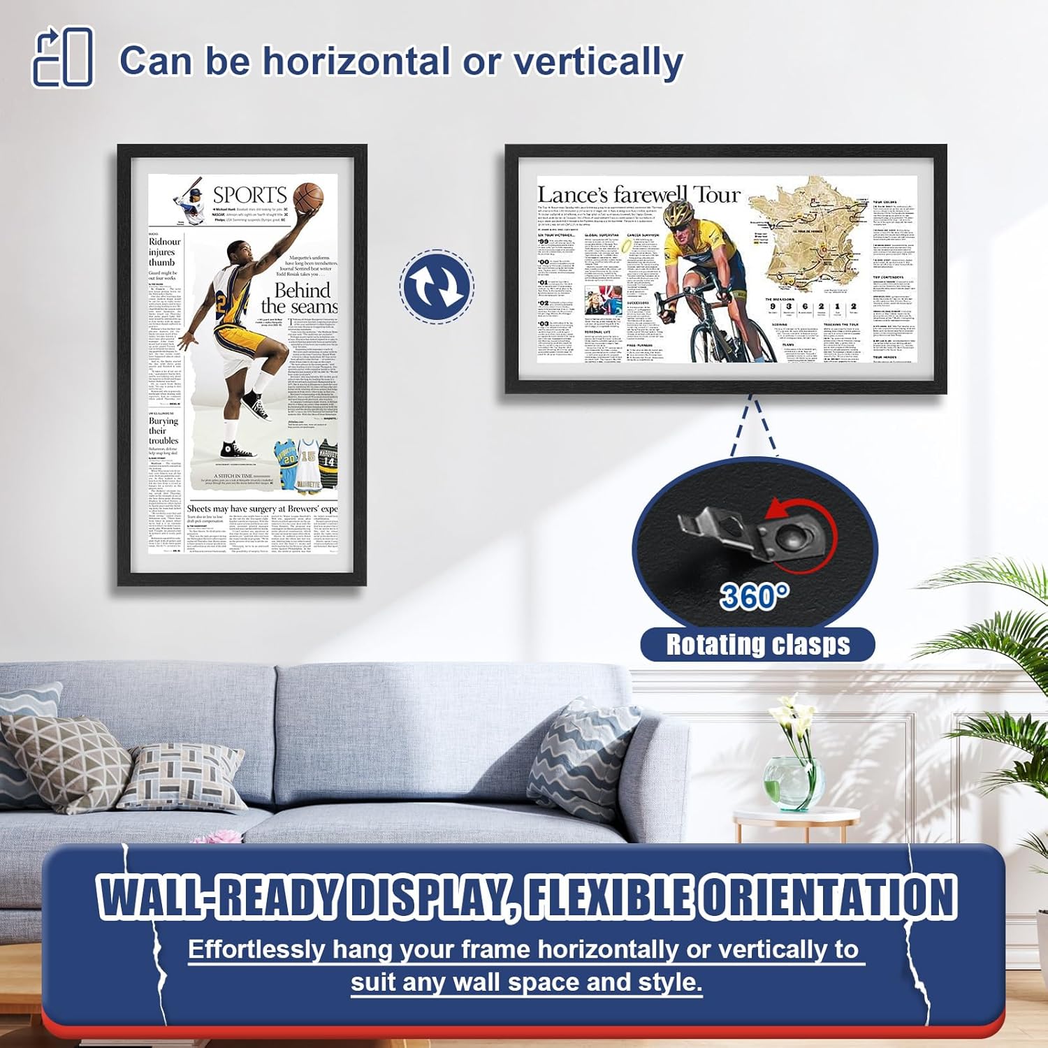 - Larger Frame, No Trimming Needed – Measuring 14.09" × 25.08", the JupDec large newspaper frame offers roughly 30% more display space than standard frames on the market. While others may require you to cut or fold your precious newspaper to make it fit, ours preserves every inch of your keepsake—no damage, no compromise, just a perfect fit for your memories.