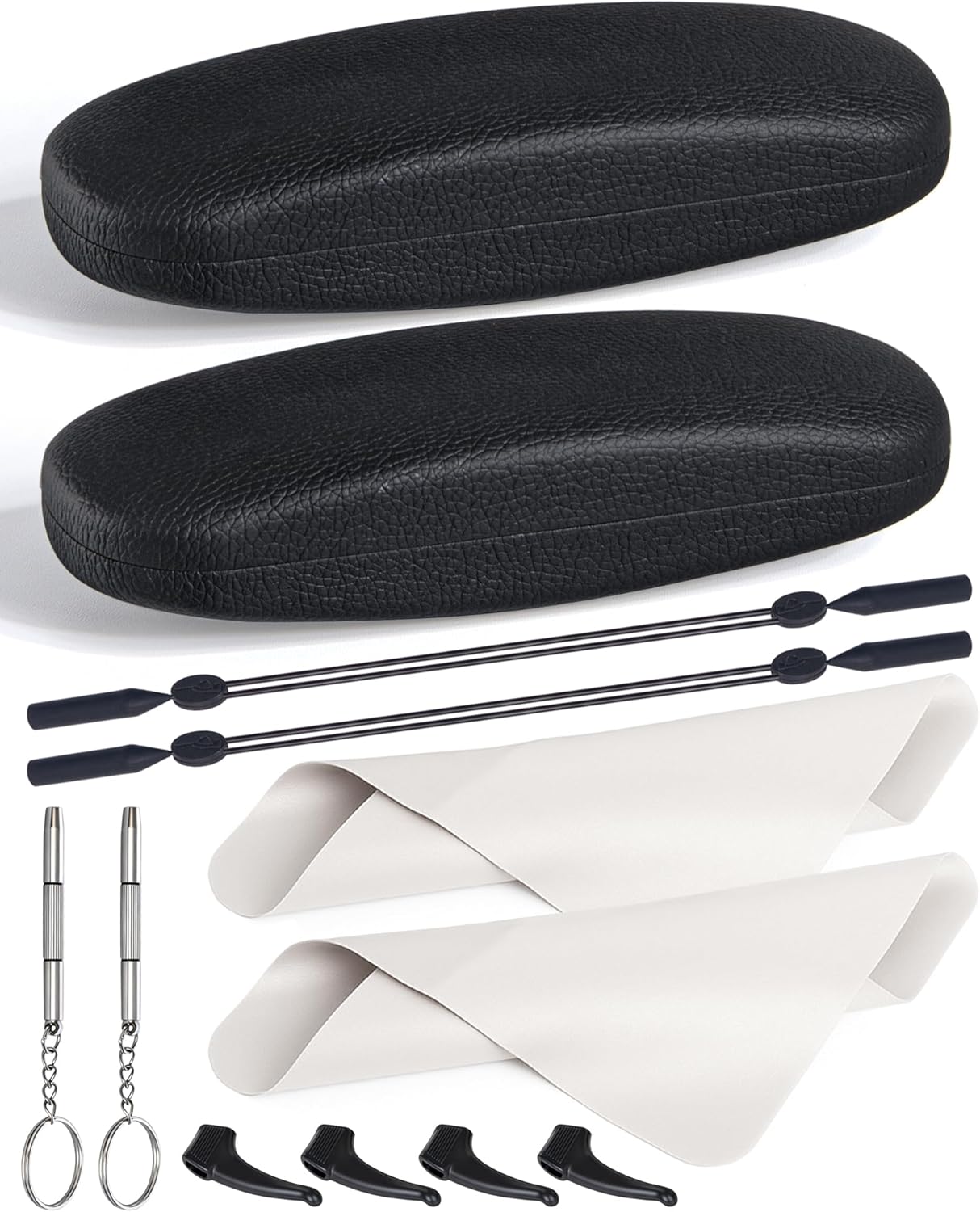 - Combination Device: Glasses necessary accessories includes 1 pack hard shell glasses case, 1 pcs of glasses cleaning cloth, 1 pcs anti-slip adjustable glasses strap, 1 pair small silicone ear grips hook, 1 pack mini screwdriver, these glasses accessories will bring you a surprising experience