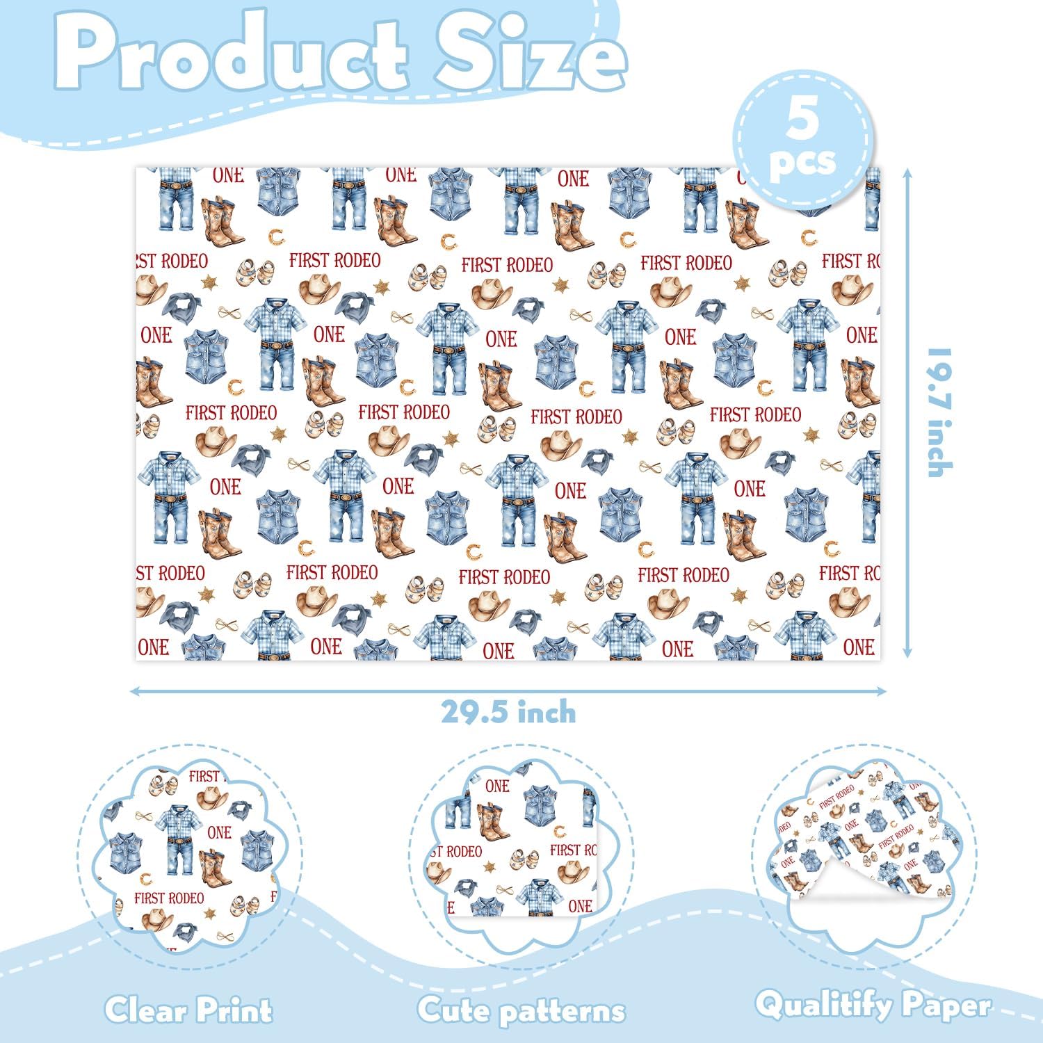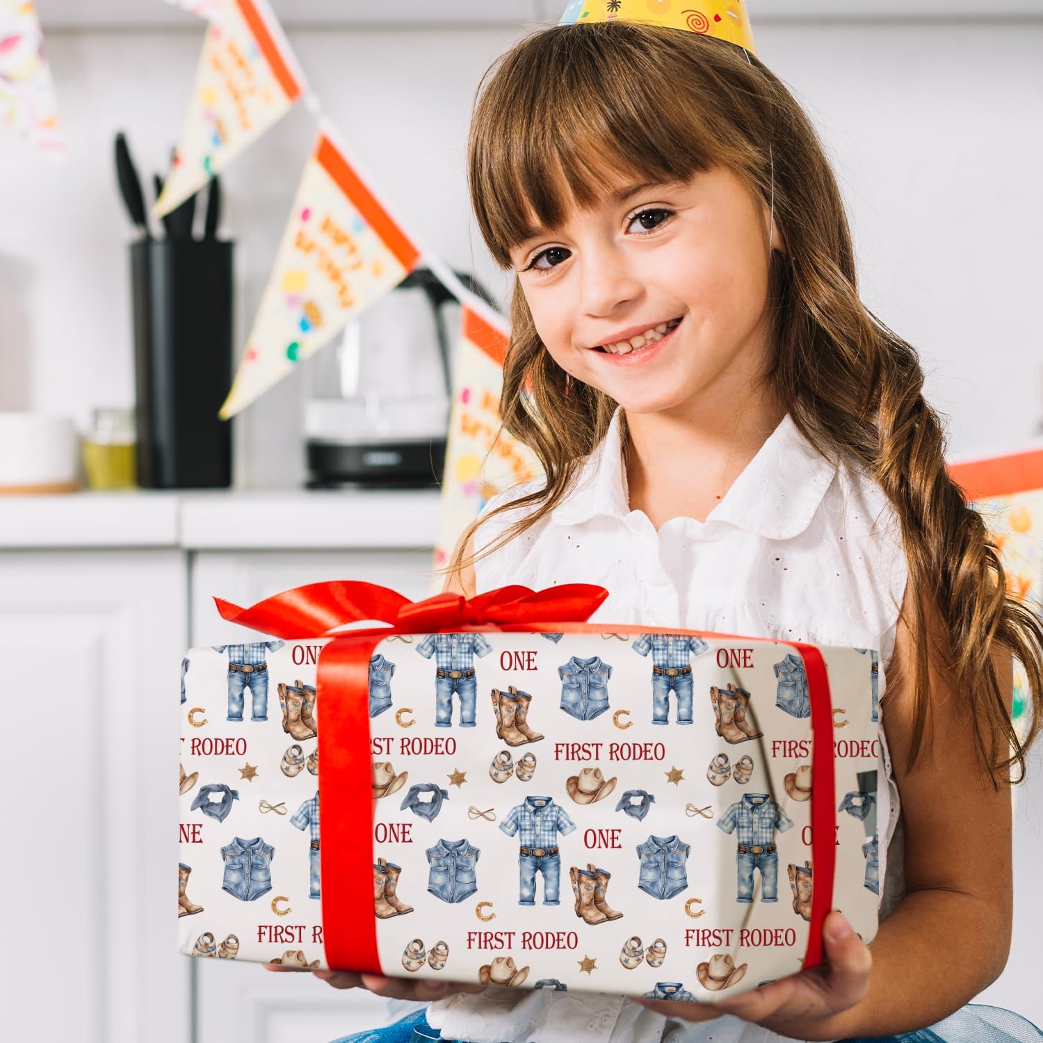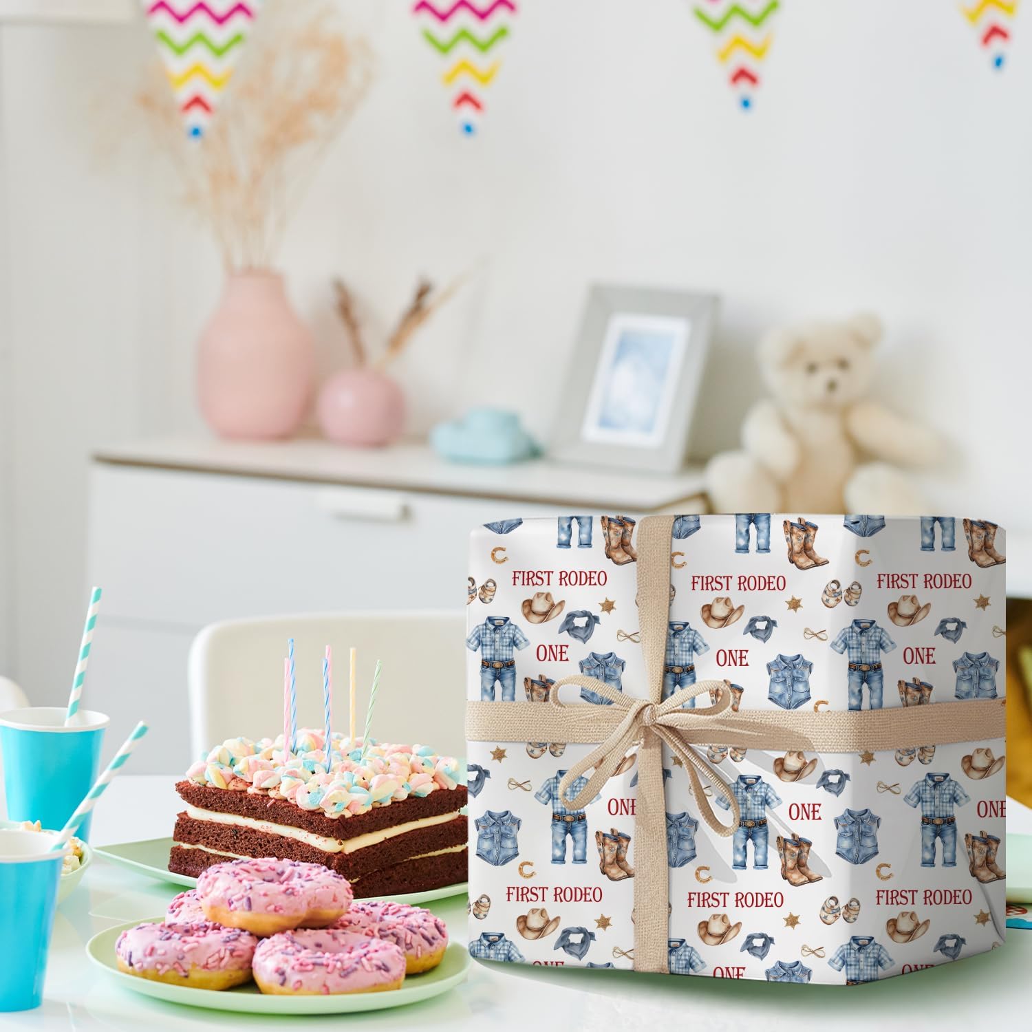 - Western Wrapping Paper Package Contents:You will receive a complete set of 5 sheets of quality western wrapping paper, featuring cowboy elements and "First Rodeo" design, ready to wrap 1'st birthday gifts.