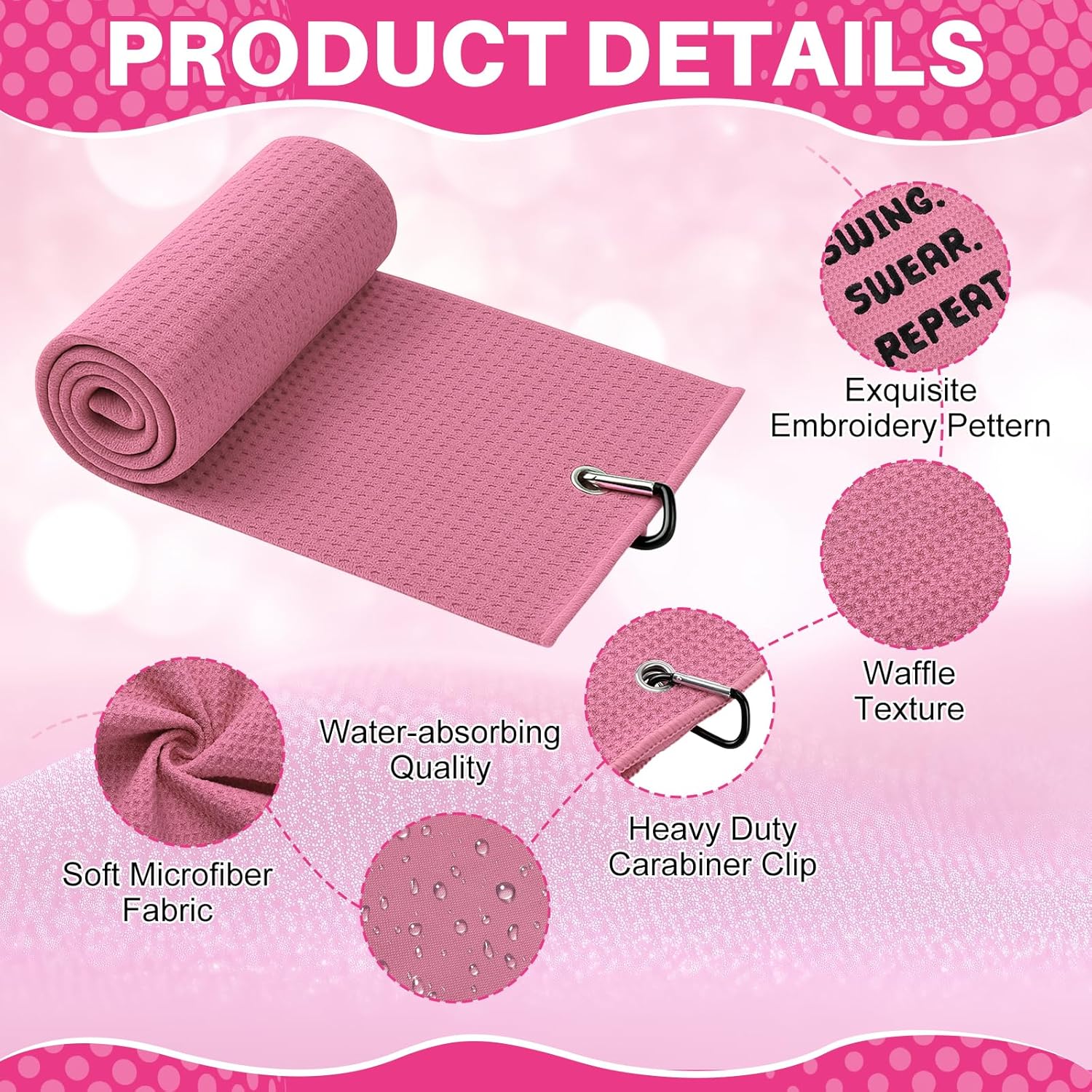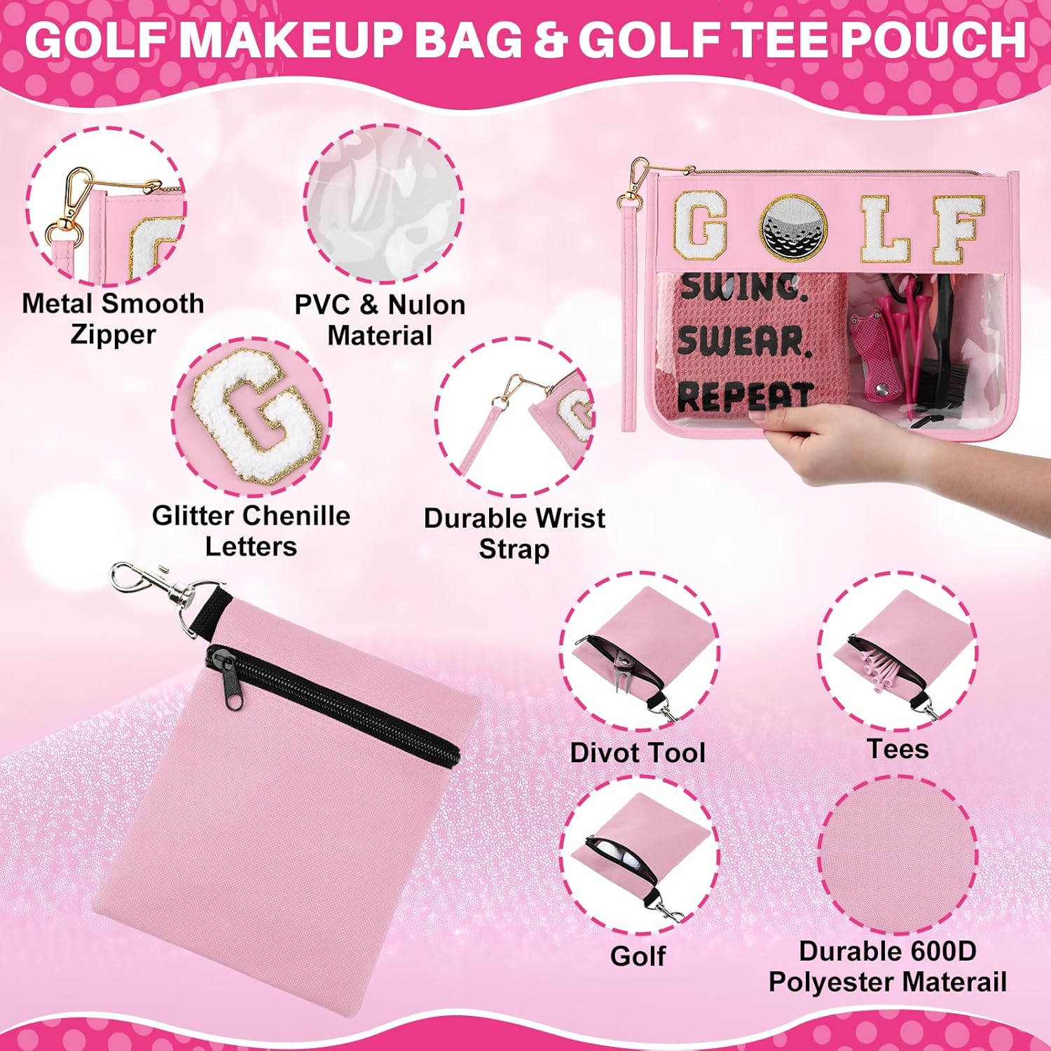 - The Perfect Set: you'll receive a complete golf accessories kit, including 1 pink golf tee pouch with hook and zipper, 1 pink golf towel, 1 pink golf makeup bag with chenille letter patch, 4 golf plastic tees, 1 repair tool towel, and 1 cleaning brush with a retractable zipper; Everything you need to focus on your swing is included