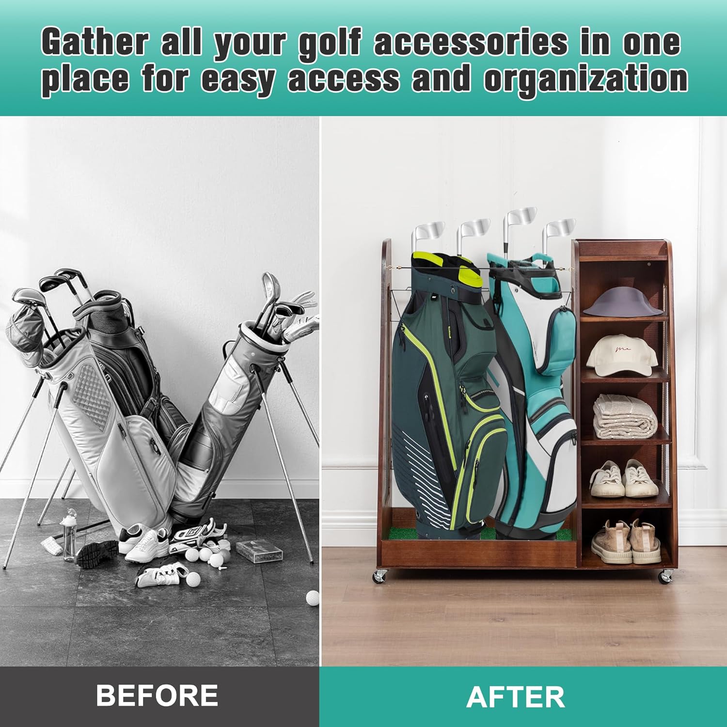 Wooden Golf Bag Organizer and Storage Rack, Wooden 2 Golf Bag Rack with Drawers, Easy to Assemble Golf Club Holder/Stand with Club Holders on Side