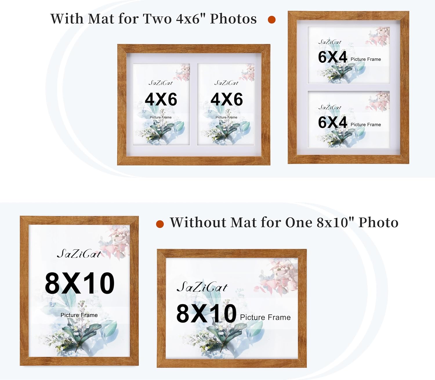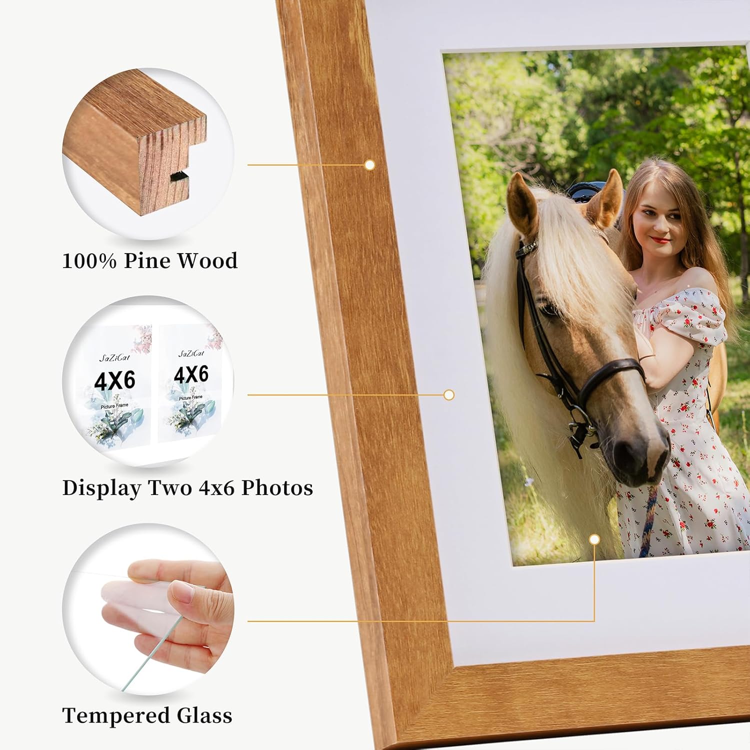 8x10 Pine Wood Collage Picture Frame Double 4x6 Picture Frame with Tempered Glass Fits 1Pc 8x10 Picture or 2Pcs 4x6 Photos With Mat For Tabletop or Gallery Wall Mounted-Teak Brown