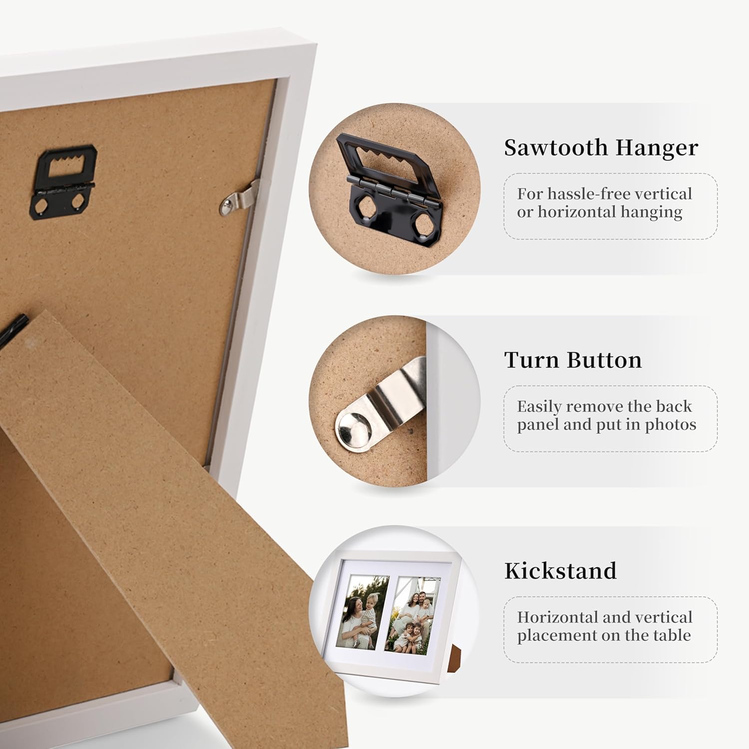 - Premium Materials: The 8x10 (8.5X11) frames are made of high-quality pine wood,durable, and without any odd smell.Tempered Glass front of the 4x6 (5X7) picture frame that gives a clear view of your pictures and preserves your photographs, cards and memories