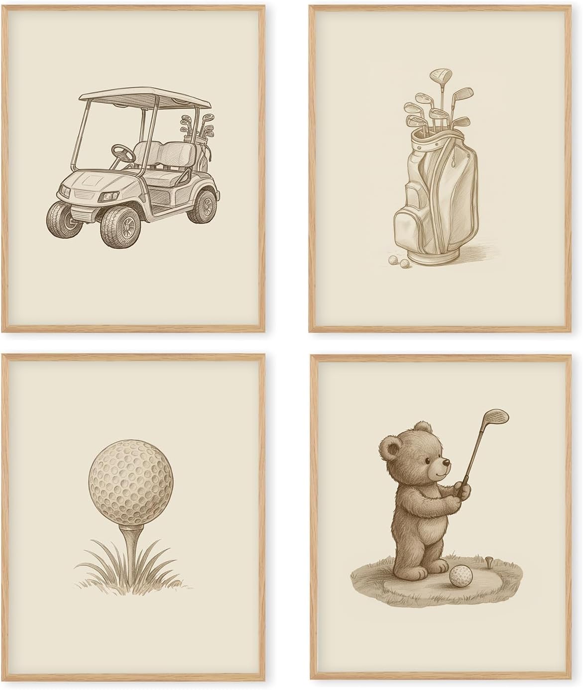 Boat Wades Vintage Bear Golfing Wall Art Prints Set of 4, Golf Nursery Decor, Retro Golf Cart Bag Bear Golfer Posters Pictures Wall Decor for Home Office Kids Room Playroom, 8x10 Unframed