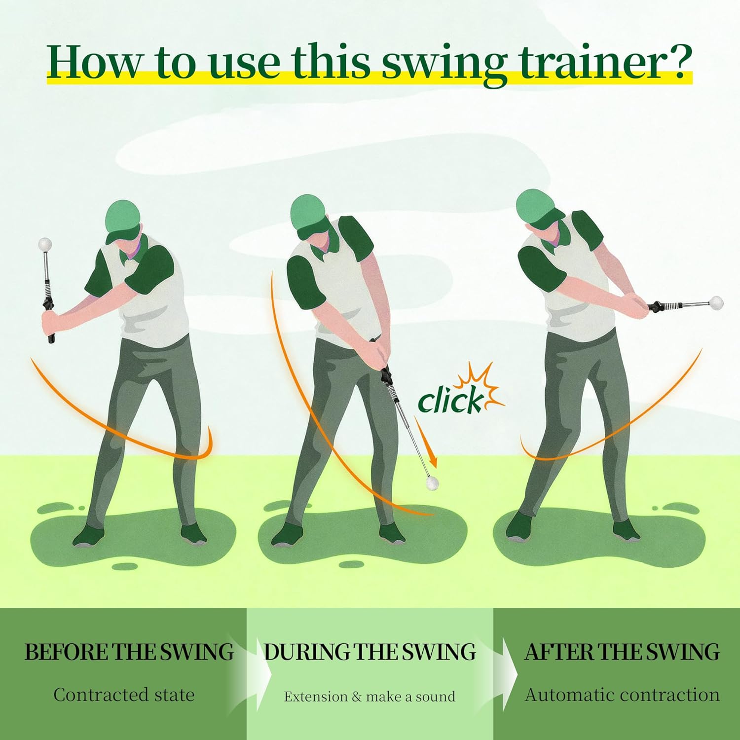 - 【Real-time Feedback for Precision Training 】Retractable golf swing training aid with sound design, providing a realistic swing sensation.When your swing is standard, the golf swing trainer aid will instant make a distinct click feedback sound, which can improve your rhythm, balance, speed and overall control. Help you to improve your golf technique with every swing golf grip training aid