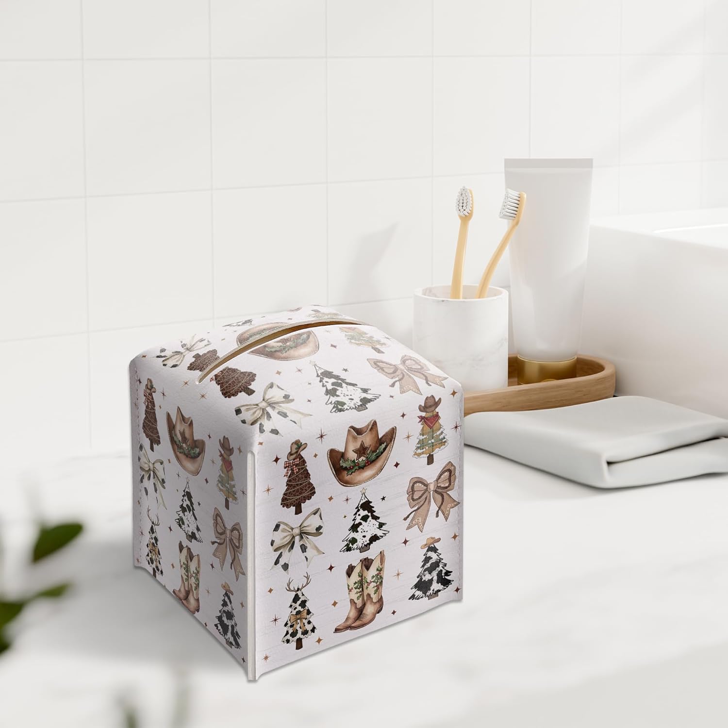 Country Christmas Tissue Box Holder, Cowgirl Boots Hat Christmas Trees Leather Tissue Box Cover Square, Paper Facial Decorative Tissues Cover for Bathroom Kitchen Office Home Decor-B33