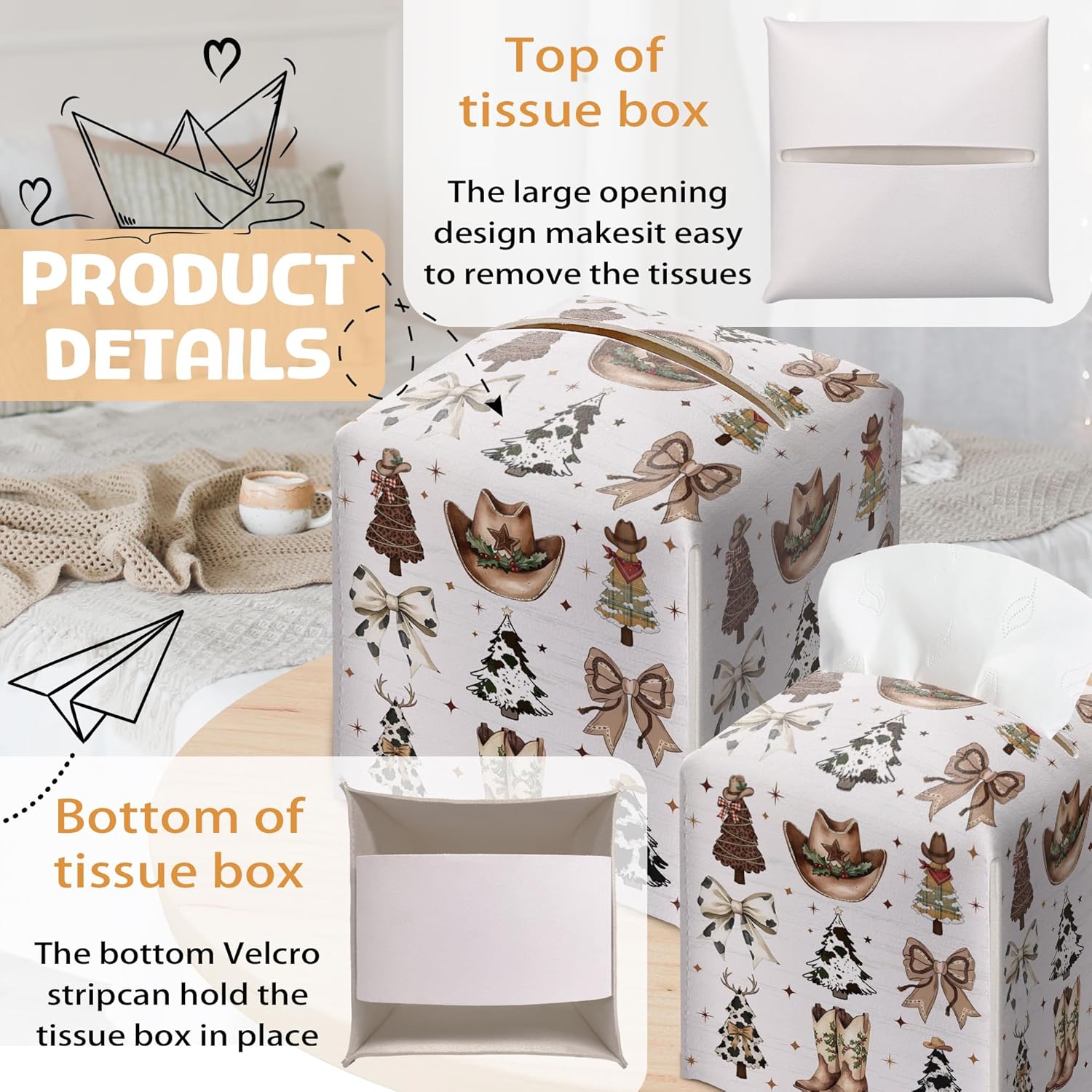 - Easy to Replace: Our Christmas Tissue Box Holder features a secure belt with an open bottom design, allowing for quick and effortless tissue replacement. The wide opening provides easy access to tissues, making it a practical choice for any environment
