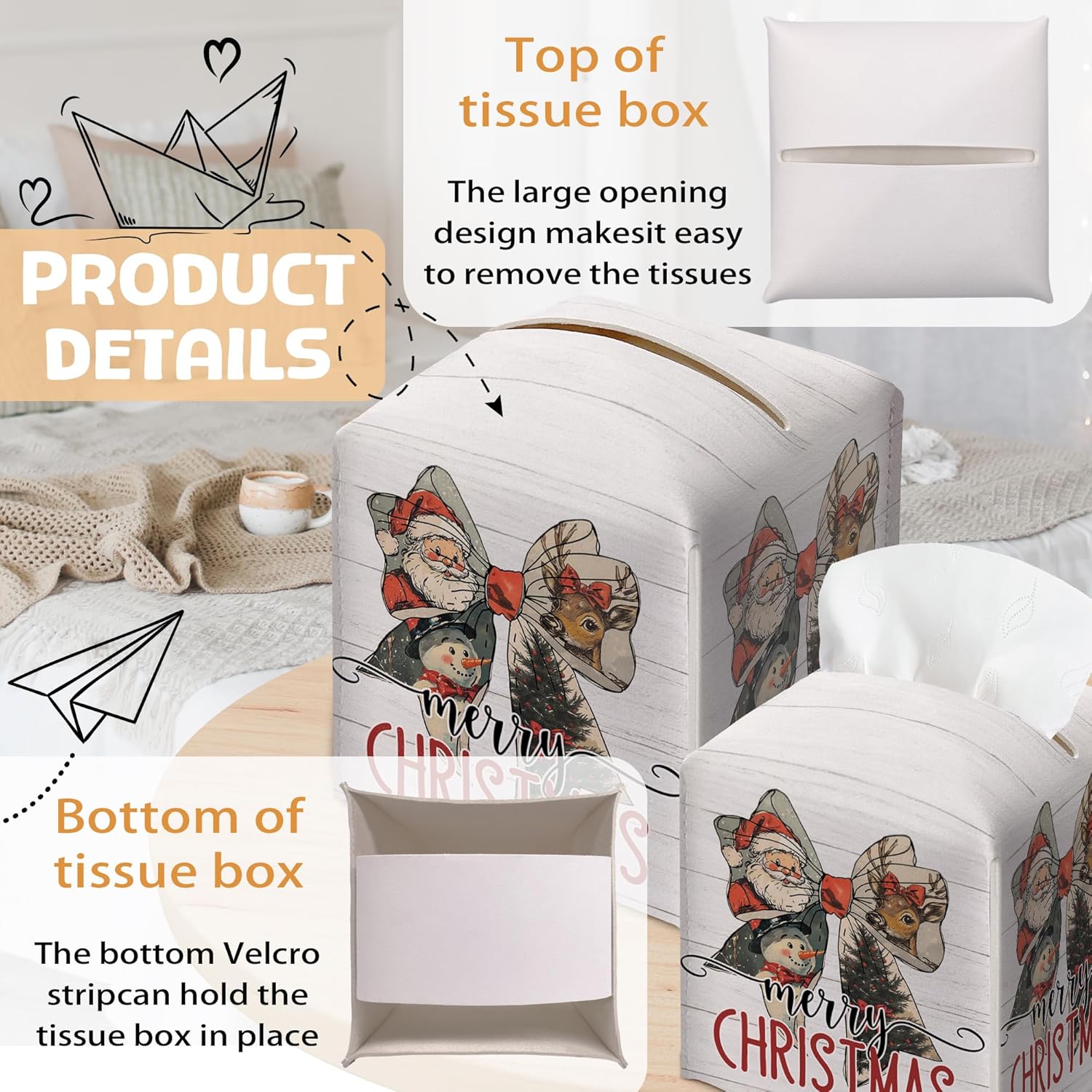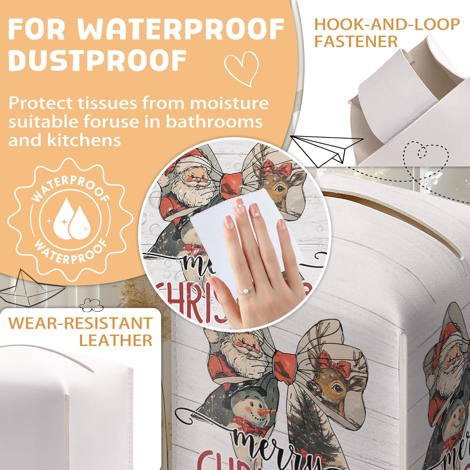 Merry Christmas Tissue Box Holder, Santa Claus Bow Reindeer Snowman Leather Tissue Box Cover Square, Paper Facial Decorative Tissues Cover for Bathroom Kitchen Office Home Decor-B26