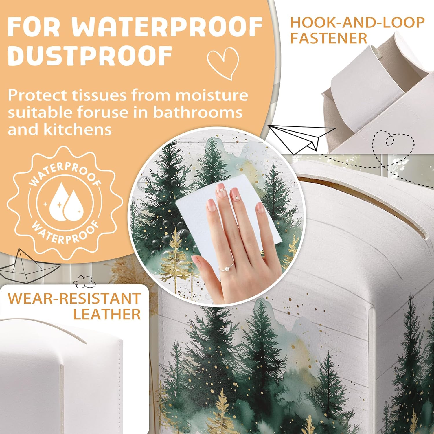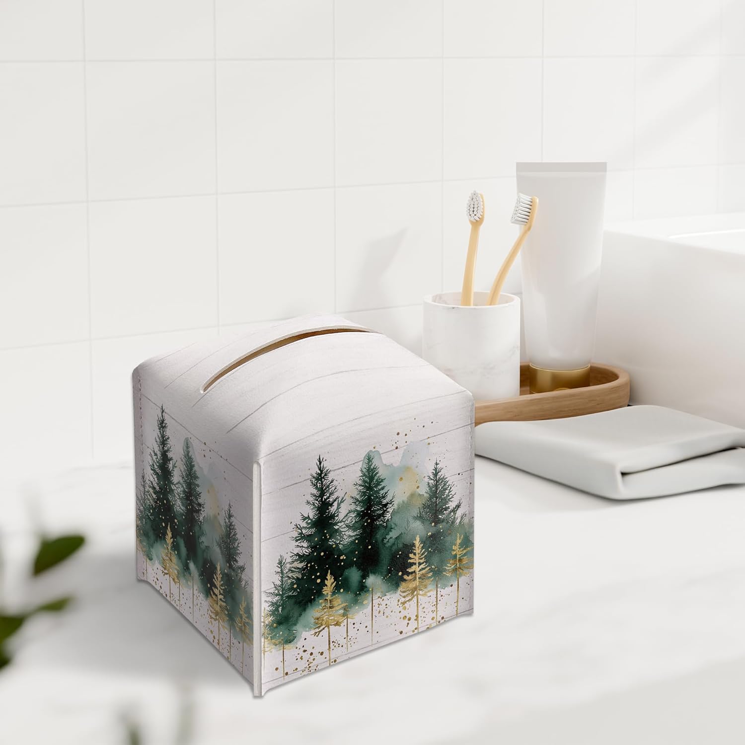 Winter Pine Tree Tissue Box Holder, Christmas Tree Leather Tissue Box Cover Square, Paper Facial Decorative Tissues Cover for Night Stands Bathroom Kitchen Office Home Decor-B17