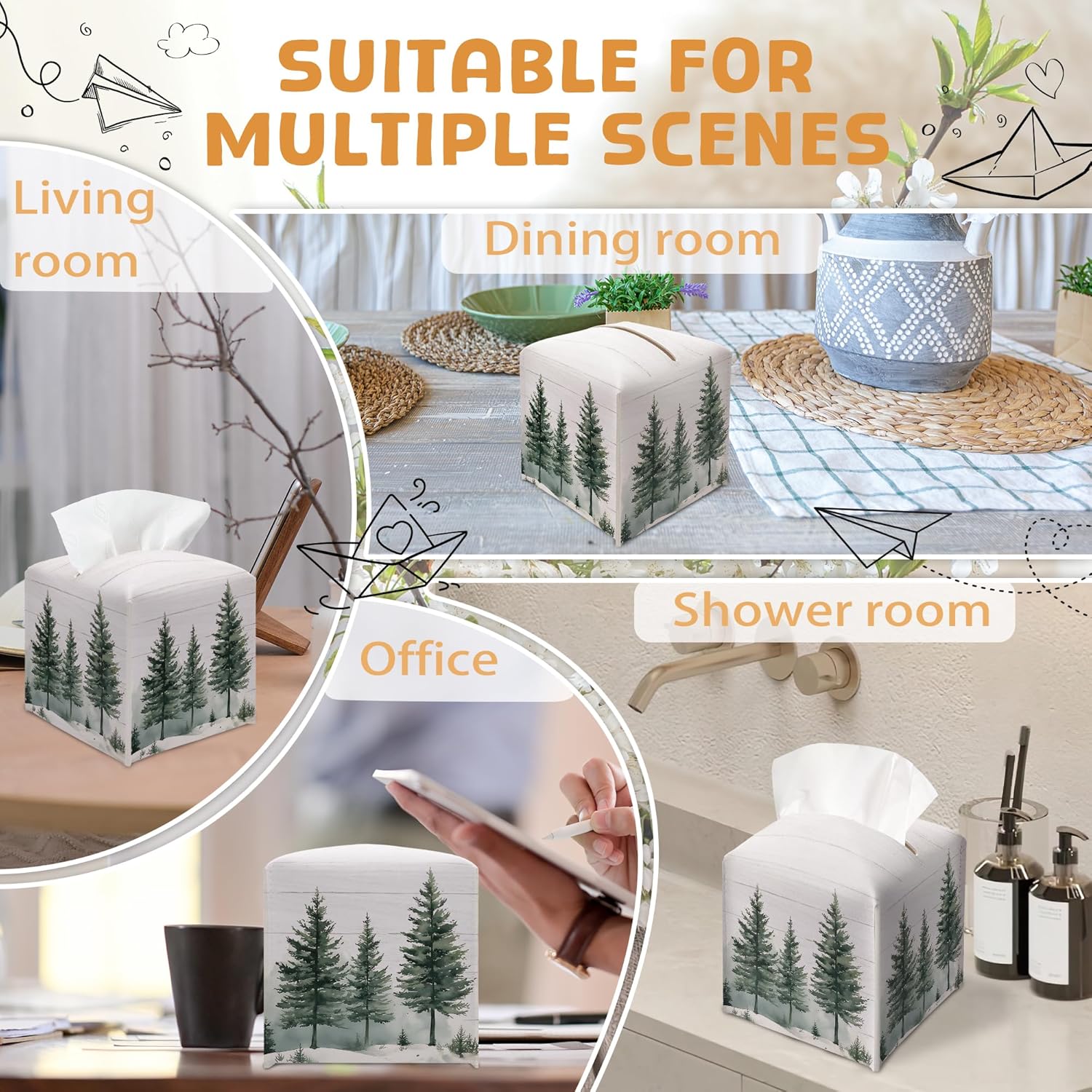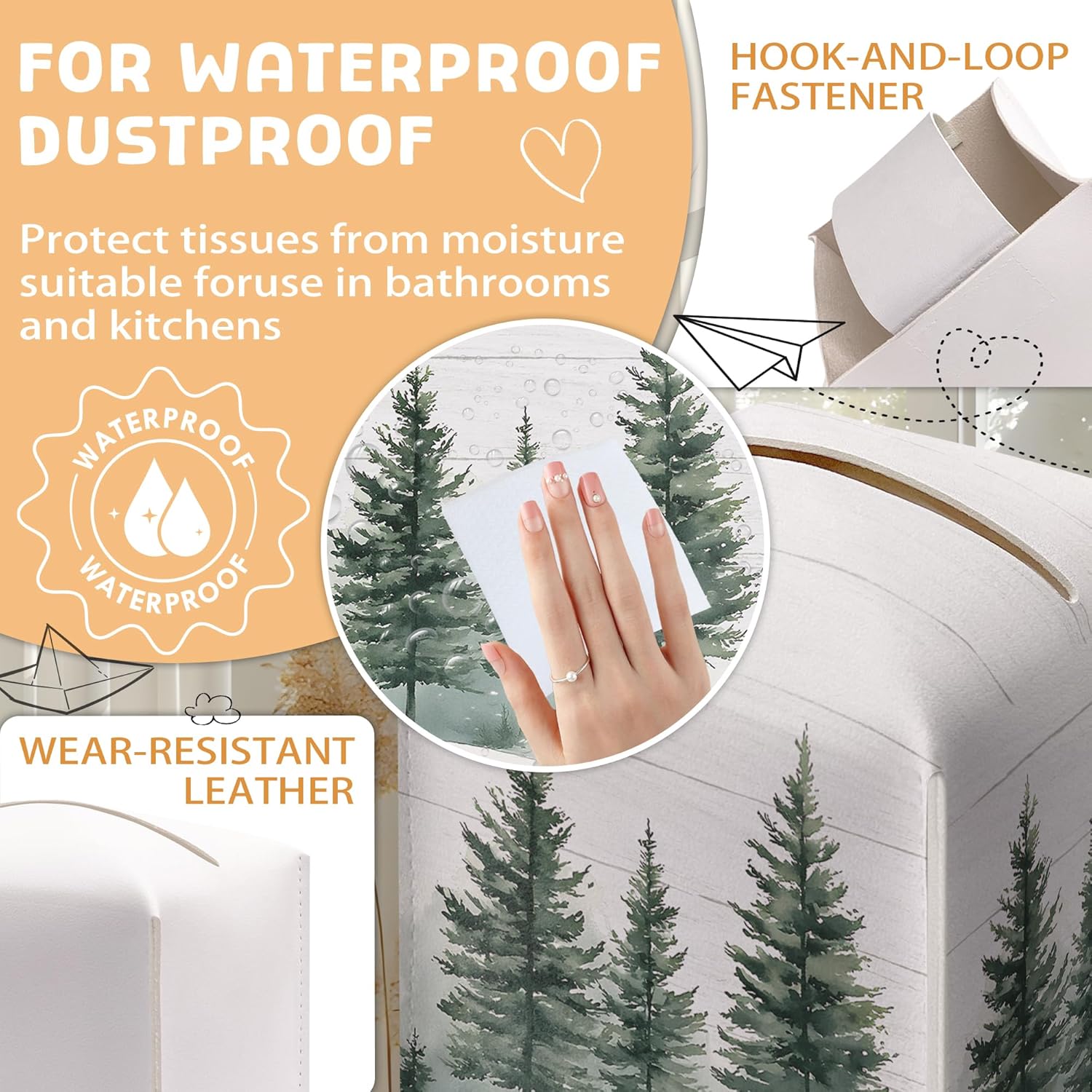 Winter Pine Tree Tissue Box Holder, Christmas Tree Leather Tissue Box Cover Square with Bottom Belt, Paper Facial Decorative Tissues Cover for Night Stands Bathroom Kitchen Office Home Decor-B21