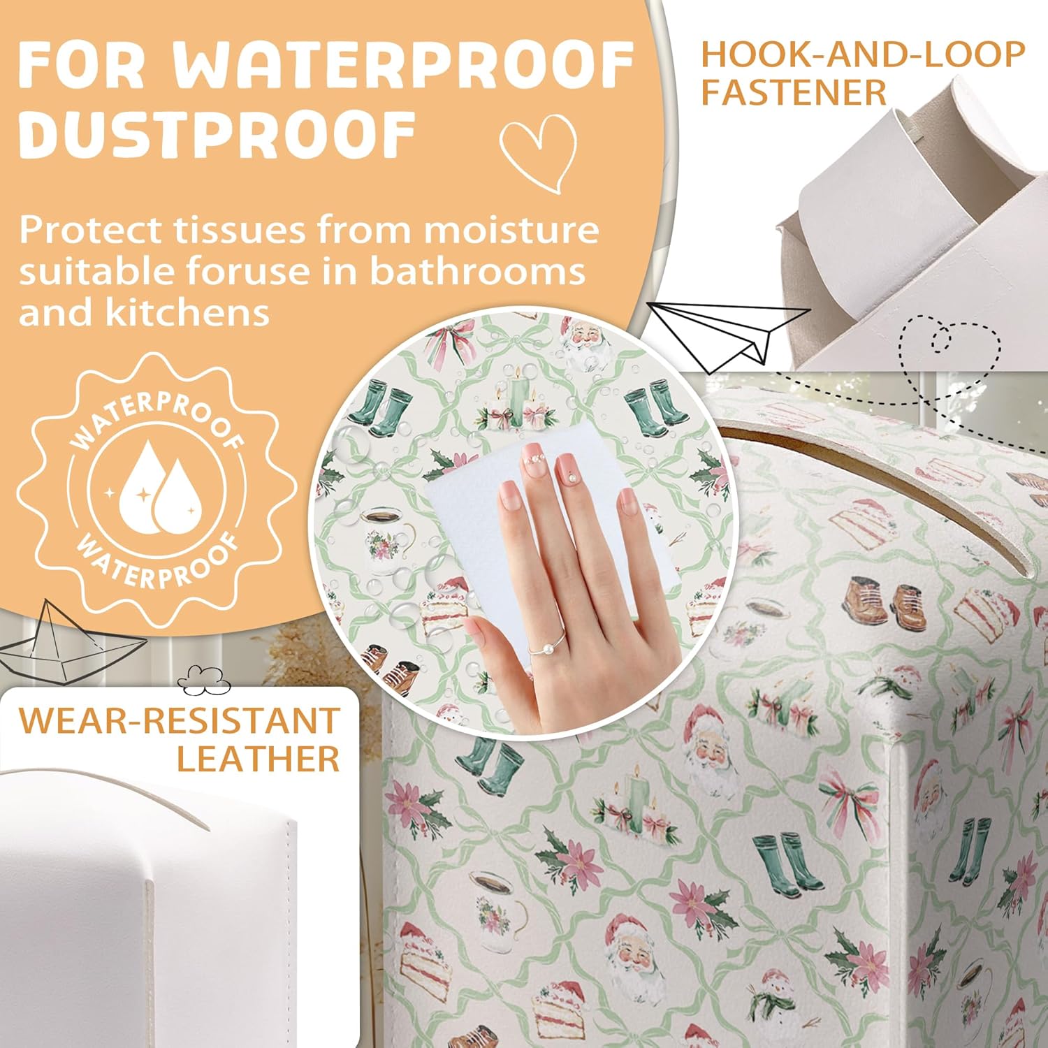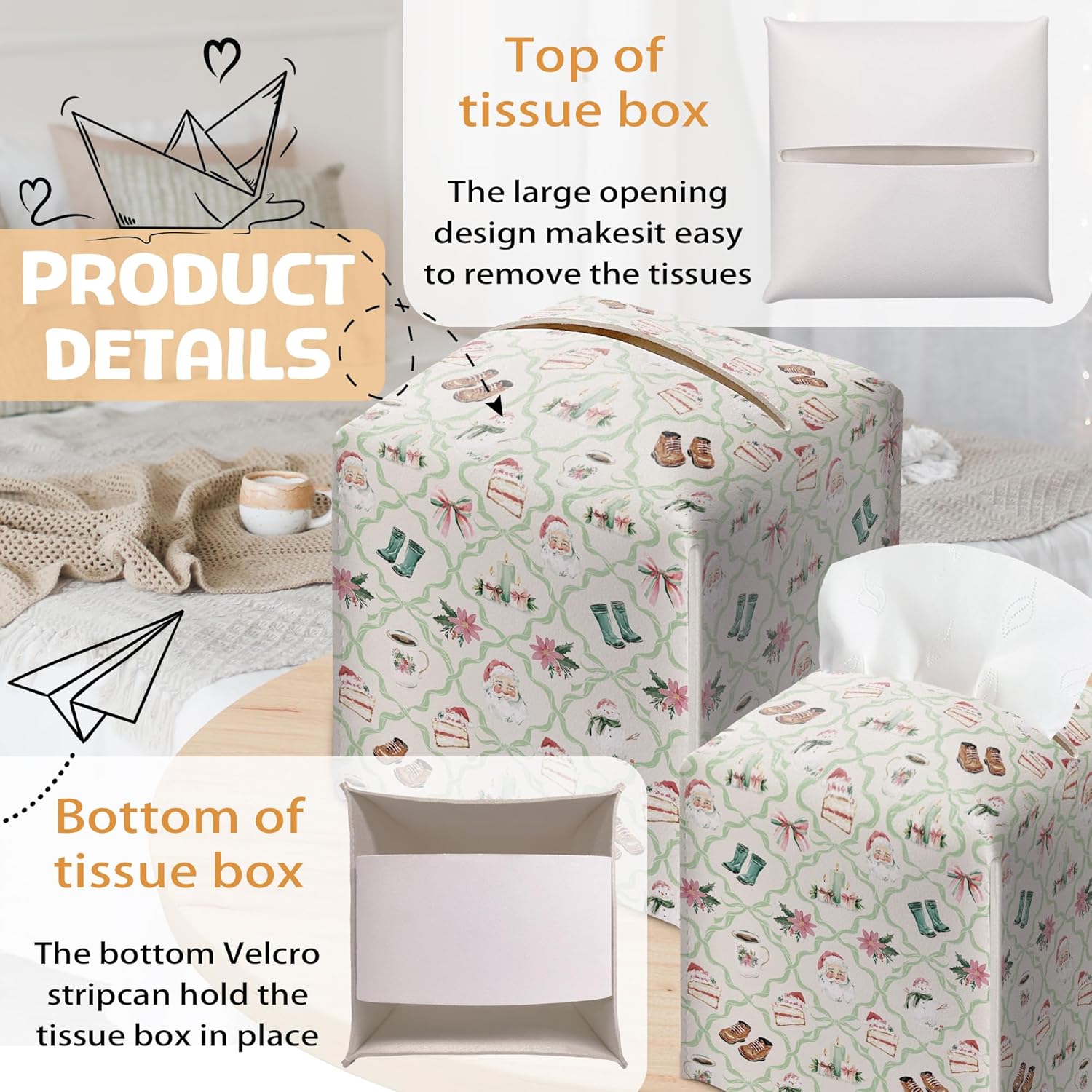 - Easy to Replace: Our Christmas Tissue Box Holder features a secure belt with an open bottom design, allowing for quick and effortless tissue replacement. The wide opening provides easy access to tissues, making it a practical choice for any environment