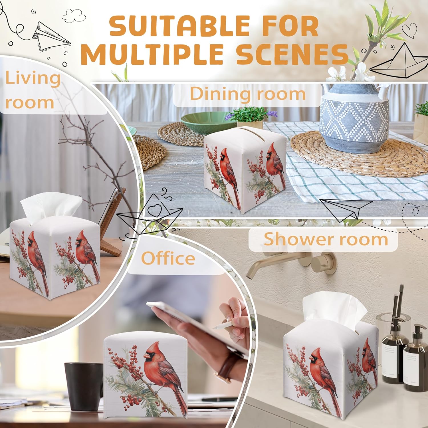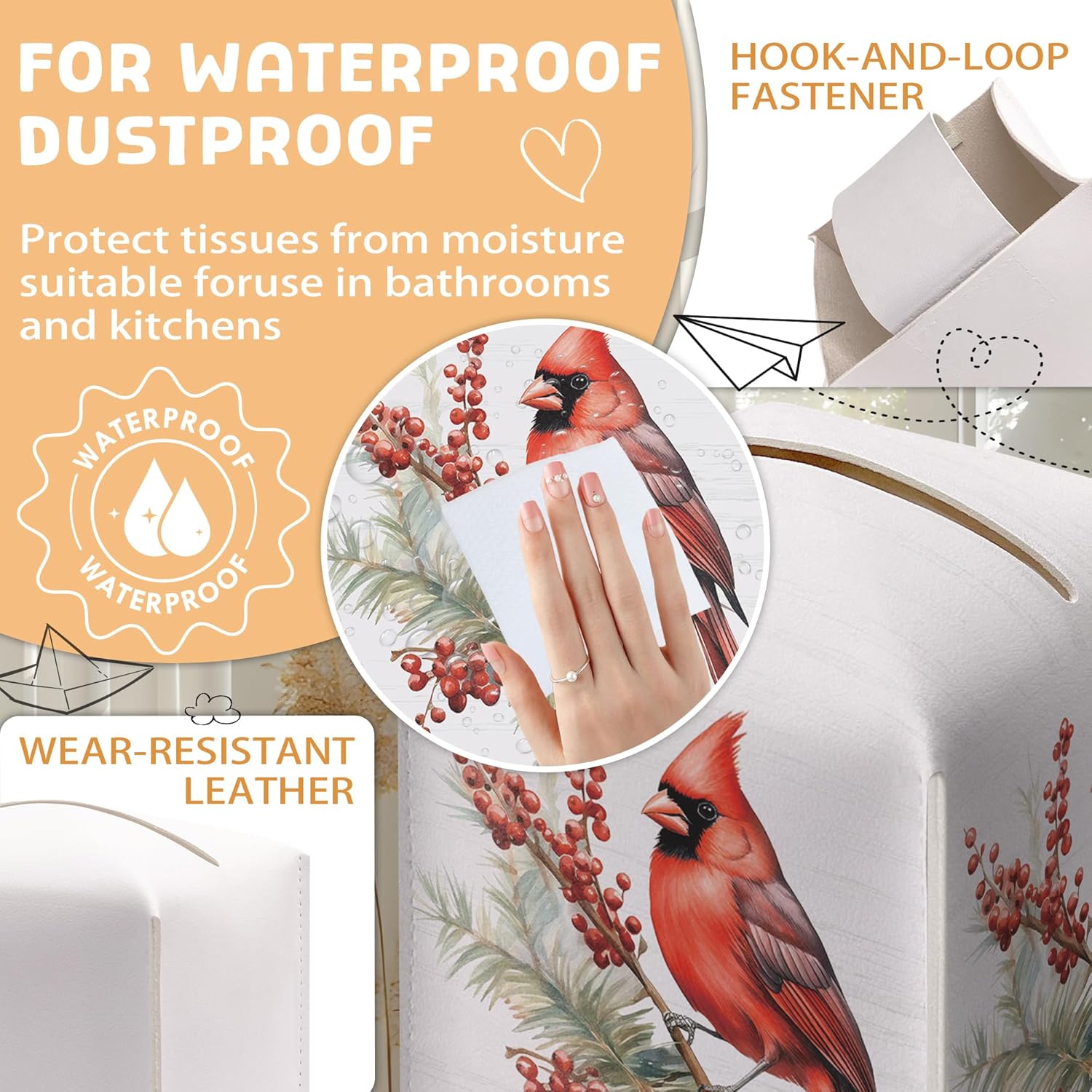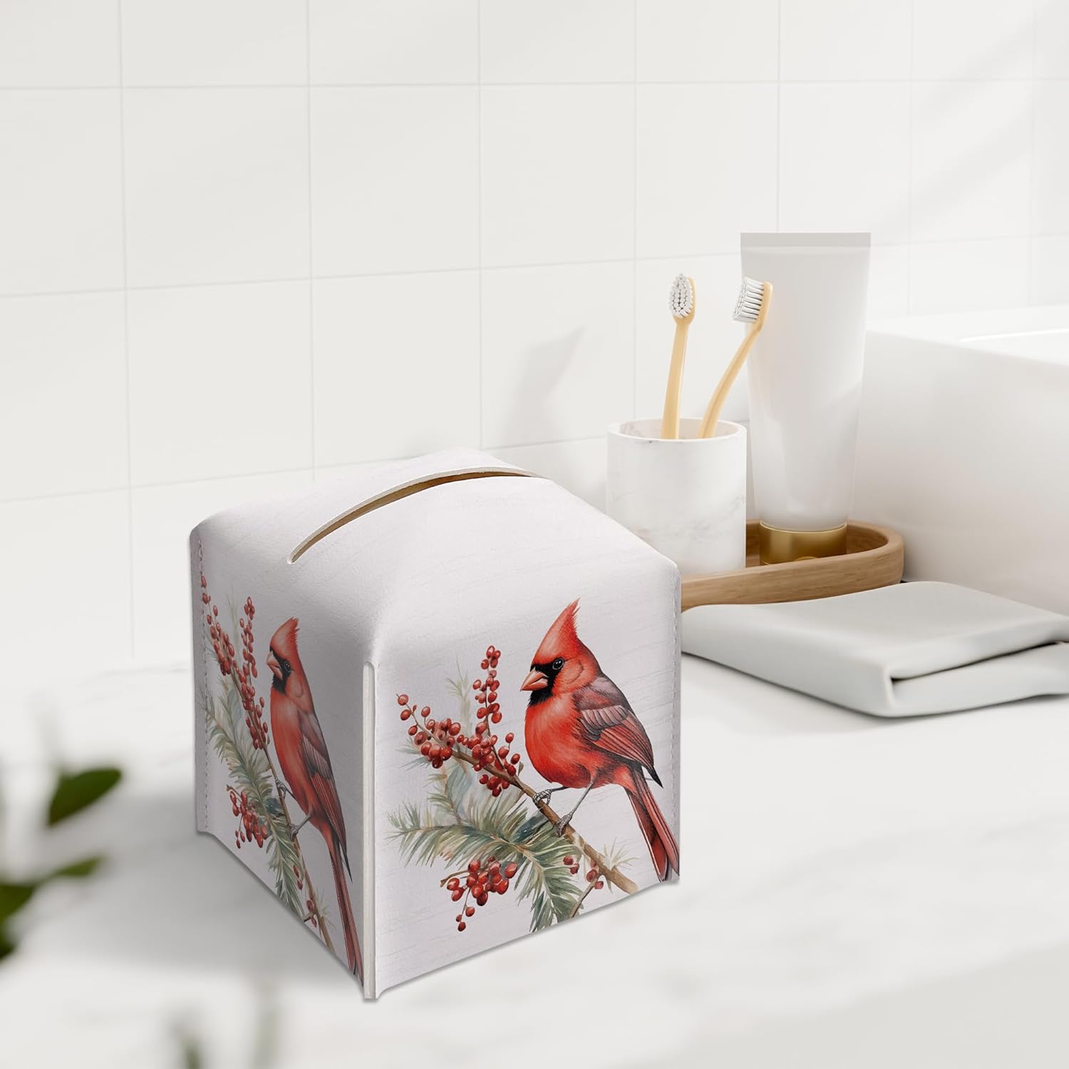 Christmas Tissue Box Holder, Christmas Cardinal Leather Tissue Box Cover Square, Red Feathers Paper Facial Decorative Tissues Cover for Night Stands Bathroom Office Home Decor-B10