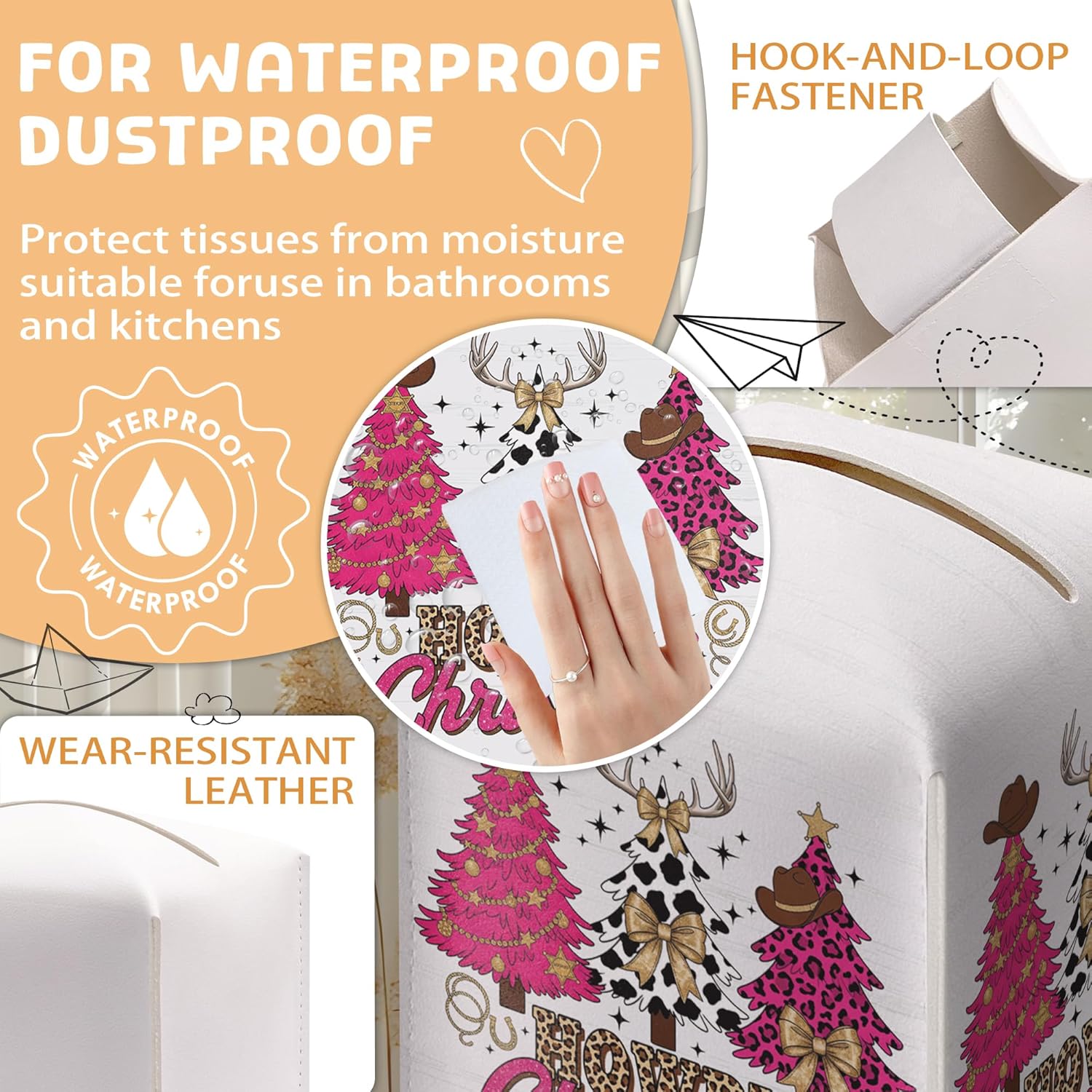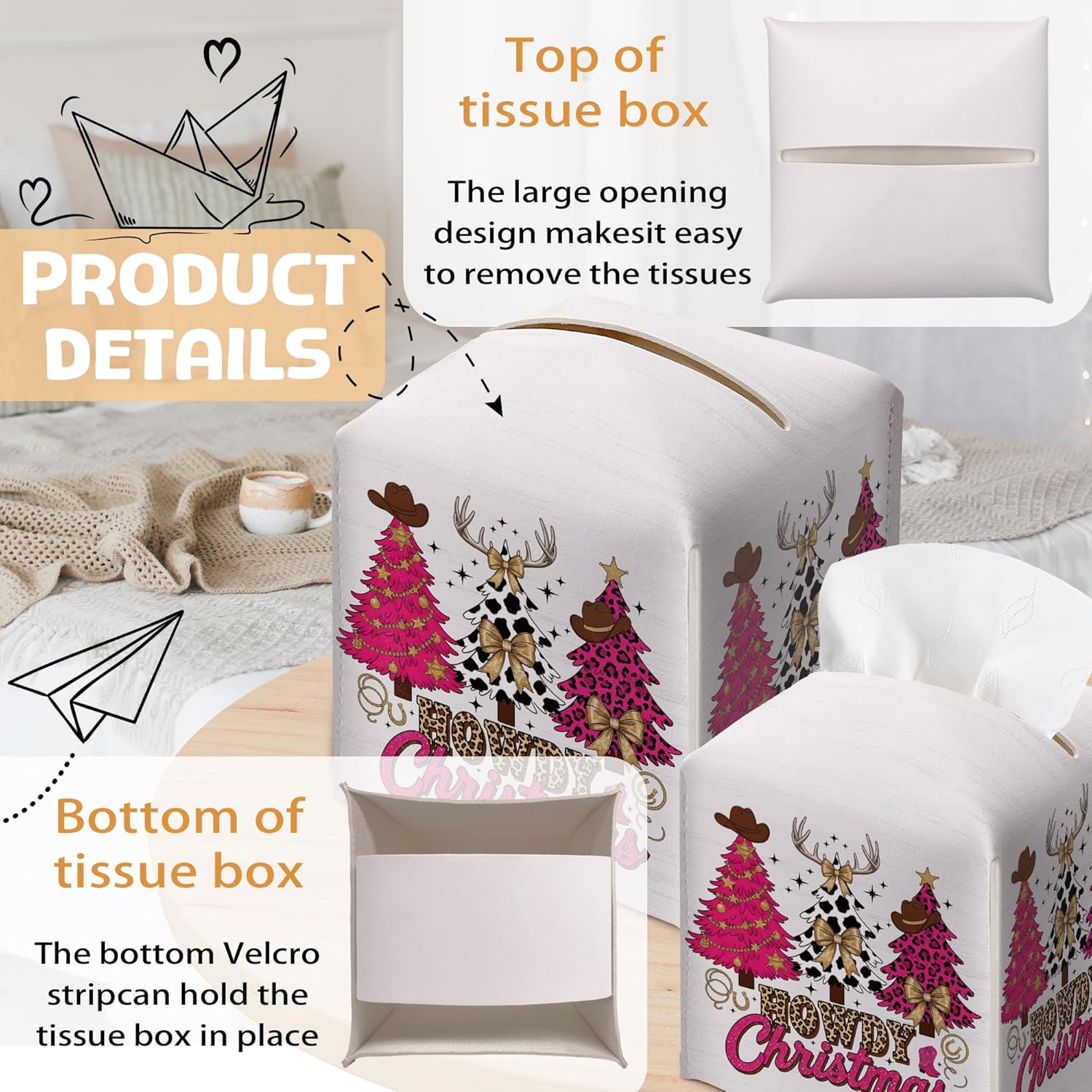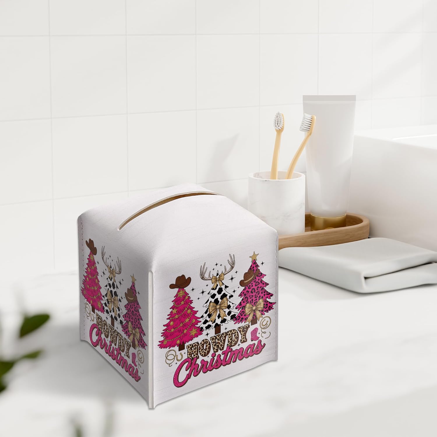 Christmas Tissue Box Holder, Pink Western Cowboy Christmas Trees Leather Tissue Box Cover Square, Paper Facial Decorative Tissues Cover for Night Stands Bathroom Office Home Decor-B08