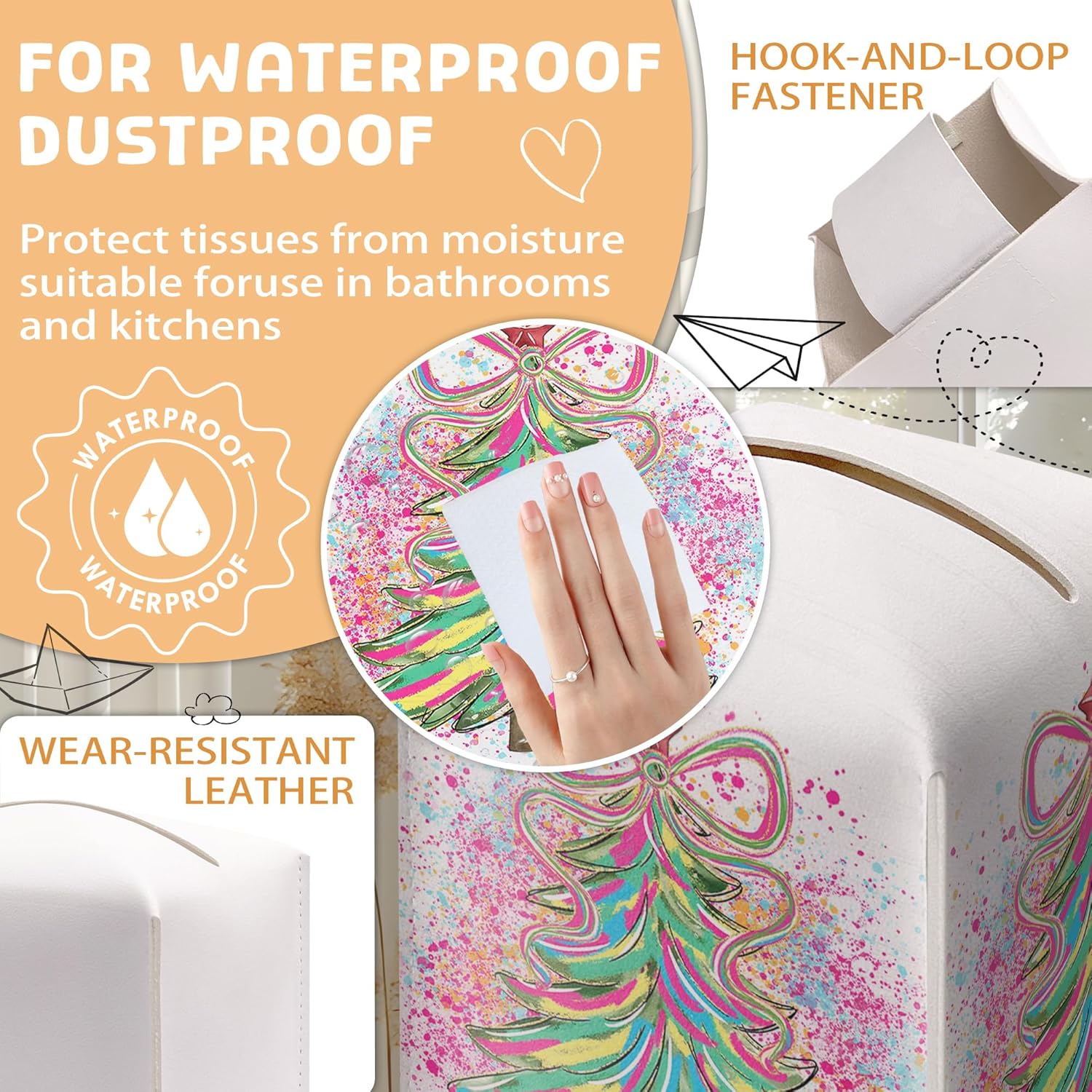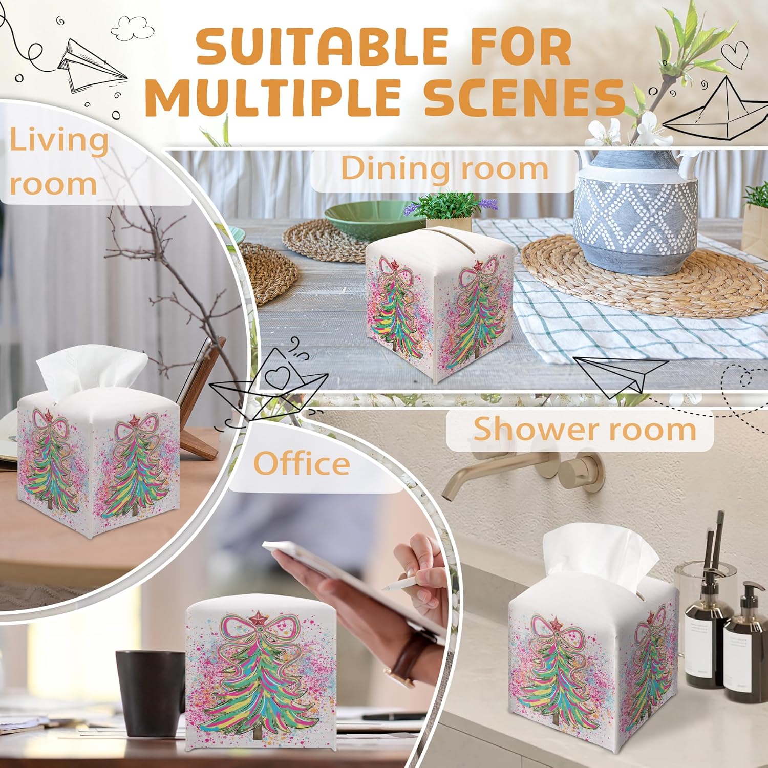 Christmas Tree Tissue Box Holder, Colorful Christmas Tree Leather Tissue Box Cover Square, Paper Facial Decorative Tissues Cover for Night Stands Bathroom Kitchen Office Home Decor-B01