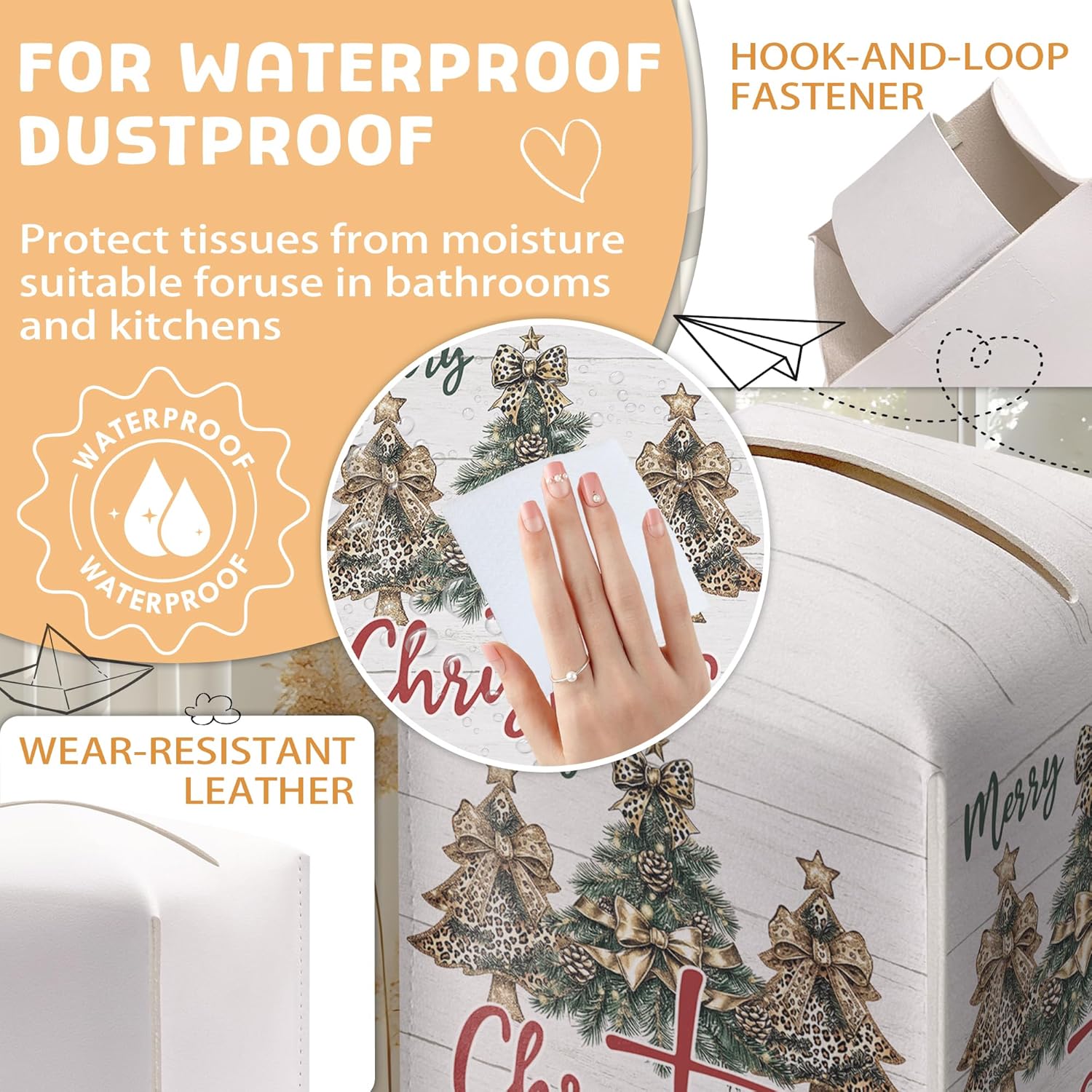 Leopard Print Christmas Tree Box Holder, Coquette Bow Sublimation Leather Tissue Box Cover Square, Paper Facial Decorative Tissues Cover for Night Stands Bathroom Office Home Decor-B29