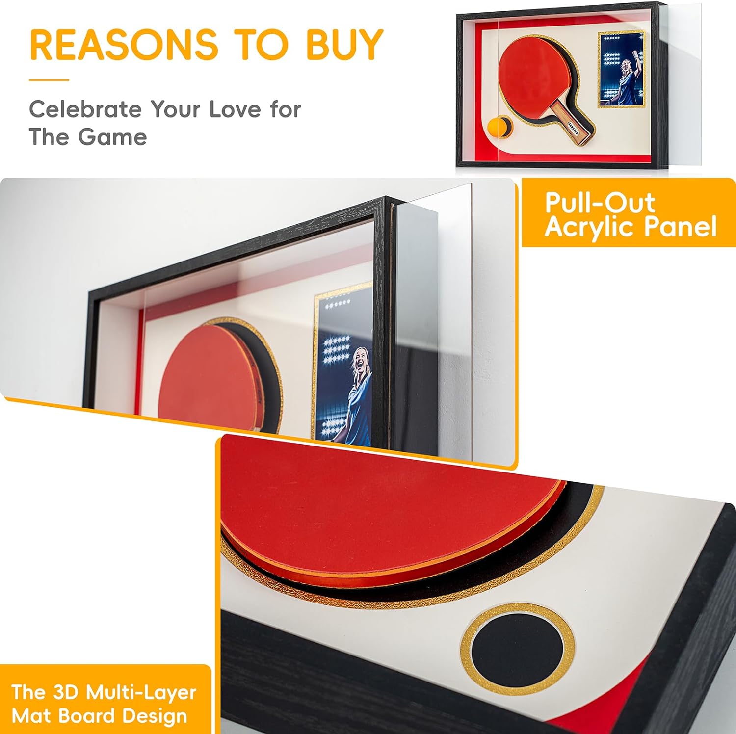 - 【SHOWCASE YOUR PASSION FOR TABLE TENNIS】 Display your racket, ping pong ball, and a favorite photo in this stylish shadow box frame — a perfect way to preserve memories, achievements, and your love for the sport