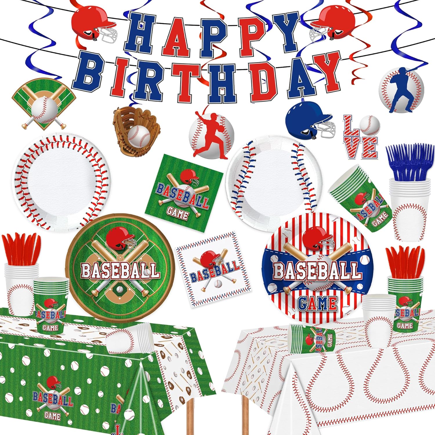 - Included Components : 【Baseball Party Supplies】: This Set Includes 20Pcs 9-Inch Plates, 20Pcs 7-Inch Plates, 20Pcs 6.5-Inch Napkins, 20Pcs Forks, 20Pcs Knives, 20Pcs Cups, 2Pcs Baseball Tablecloths (54 X 108 Inches),6Pcs Hanging Swirls With A Cool Happy Birthday Banner. Throw An Unforgettable Baseball Themed Birthday Party! 【Baseball Party Supplies】: This Set Includes 20Pcs 9-Inch Plates, 20Pcs 7-Inch Plates, 20Pcs 6.5-Inch Napkins, 20Pcs Forks, 20Pcs Knives, 20… See more
