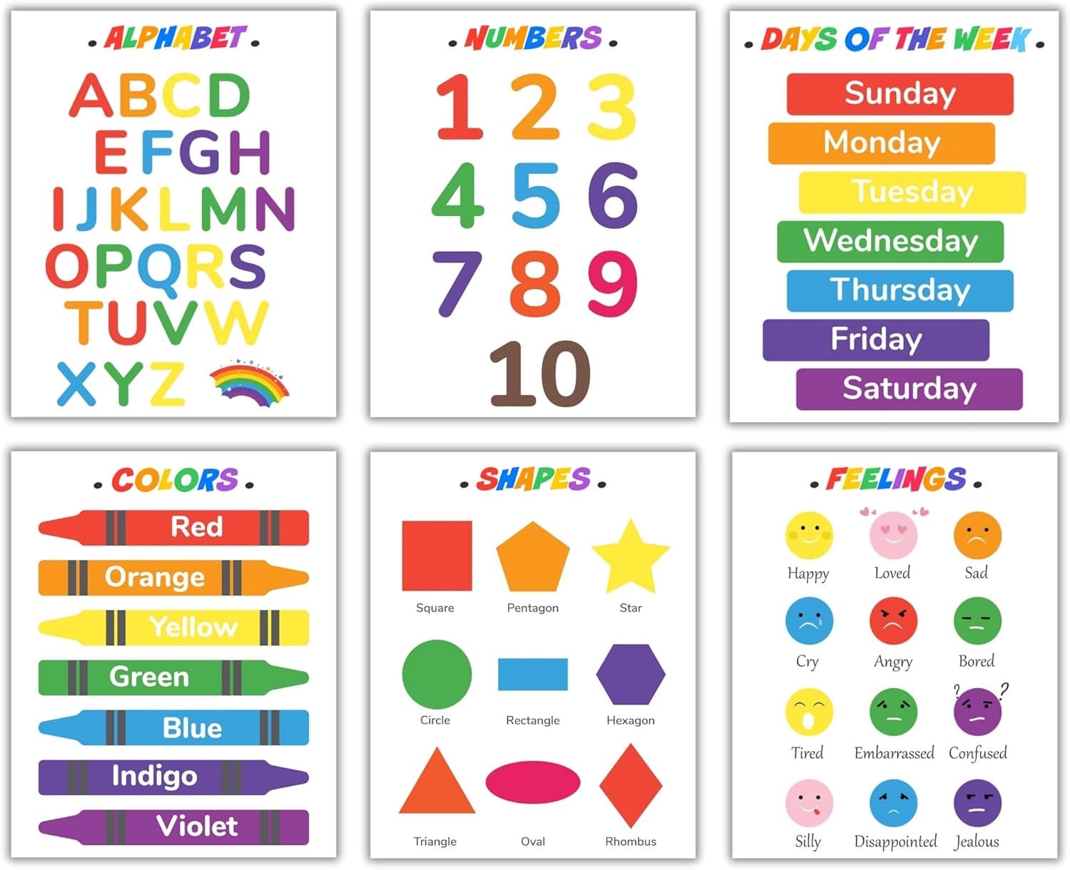 - Set of 6 Posters – Includes Alphabet, Numbers, Days of the Week, Colors, Shapes, and Feelings charts.