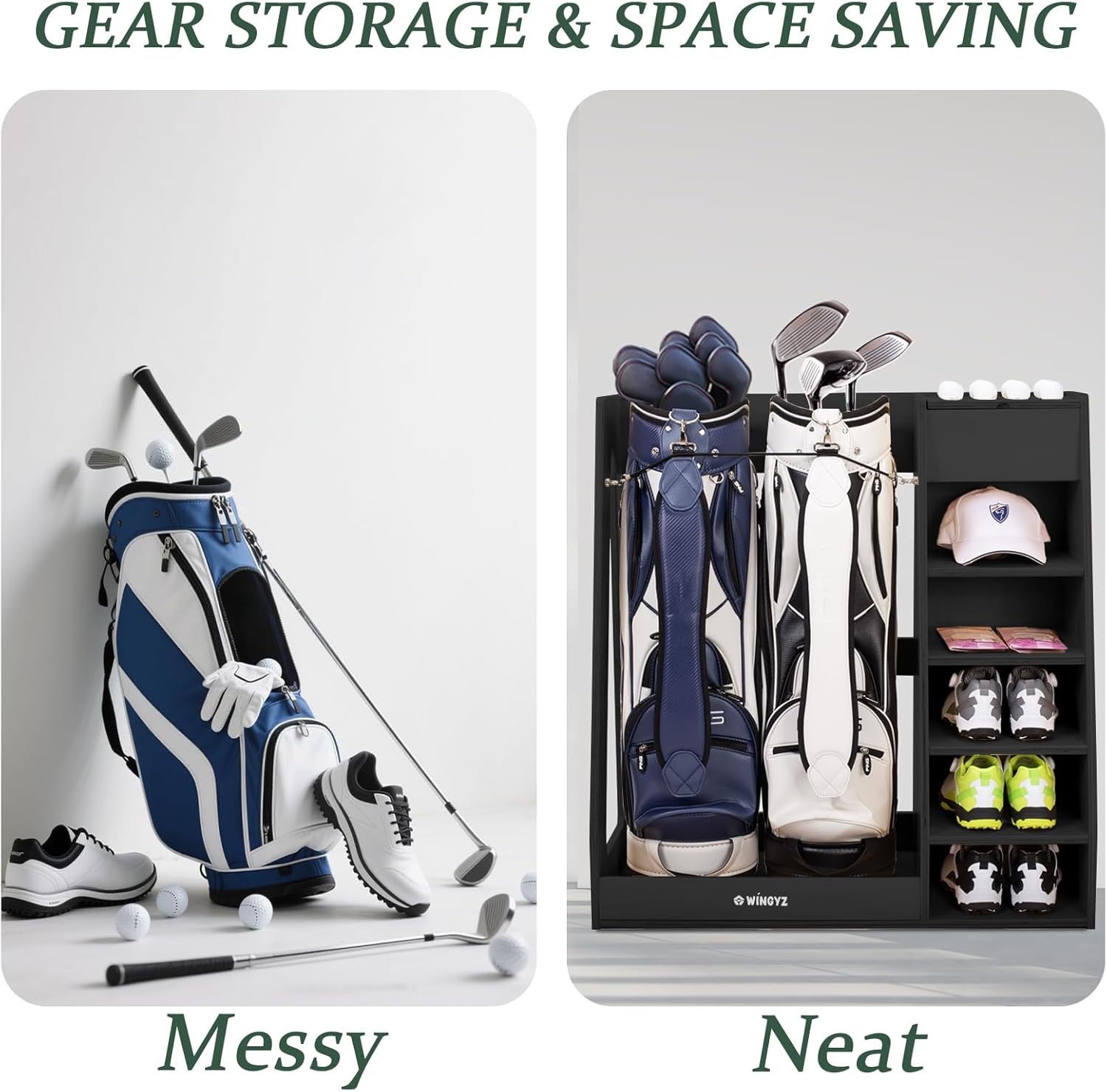 wingyz Wooden Golf Storage Organizer for Garage Fits 2 Bags for Any Level Golfer Great Gift, Golf Bag Rack Club Holder with 12-Ball Display Rack and 5 Shelves for Equipment Accessories
