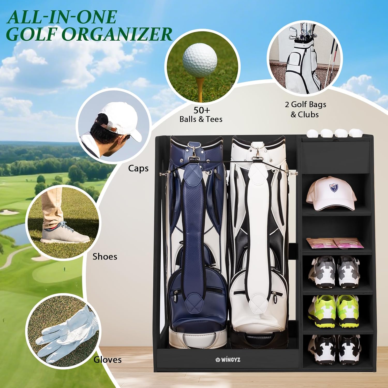 - All-in-One Golf Organizer: The wide bag compartment easily holds 2 standard golf bags and clubs. The dedicated rack displays 12 golf balls. The large top compartment and 5 shelves neatly organize 50+ balls , 100+ tees, hats, apparel, shoes, cleaning kits and more. Measuring 17"D x 34.5"W x 36"H, it keeps your golf gear neatly stored and easily accessible while saving space