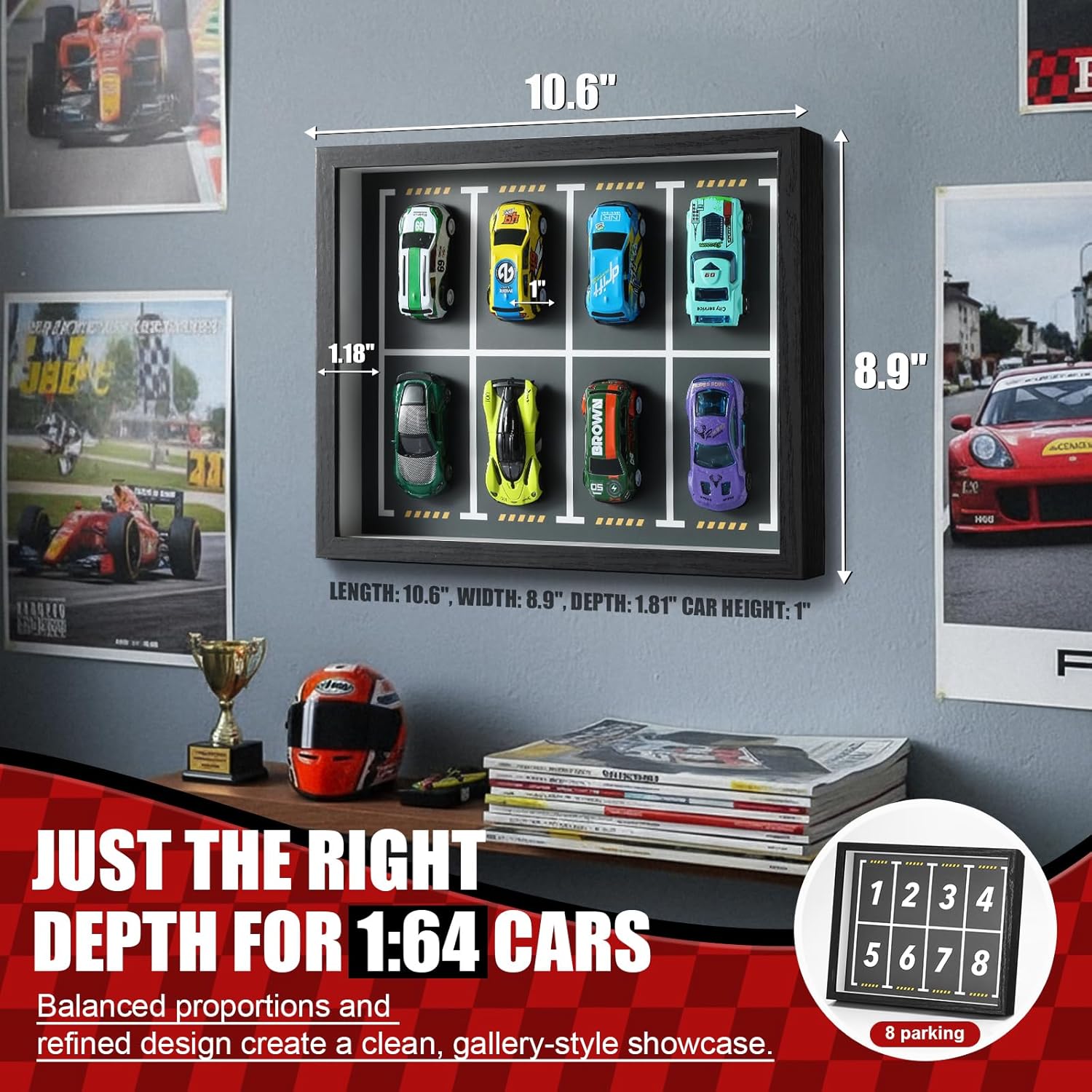 - Designed for 1:64 Scale Models - Measuring 10.6" × 8.9" × 1.7", this display frame is tailored for 1:64 scale toy car models, offering space for up to 8 vehicles. With just the right depth to protect and showcase your cars without bulk, it’s a compact yet statement-making piece—perfect for desks, walls, or shelves in any collector’s space.
